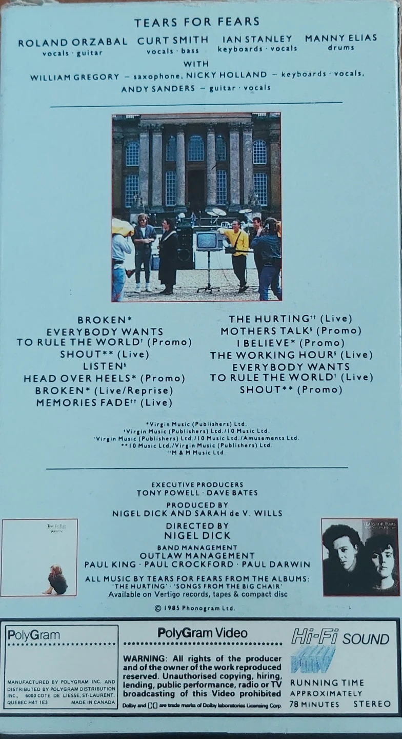 Selling a Tears for Fears video album, "Scenes From the Big Chair" on Beta tape. It includes some of their biggest hits such as Shout, Everybody Wants to Rule the World, and I Believe. The running time is approximately 78 minutes.