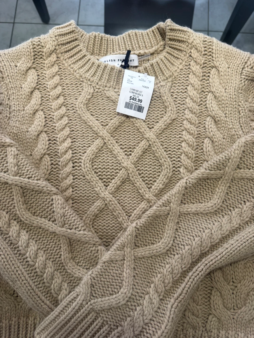 Cozy up in this English Factory cable knit sweater! It's a size small and features a beautiful cable knit design. The tag shows it was originally priced at $49.99