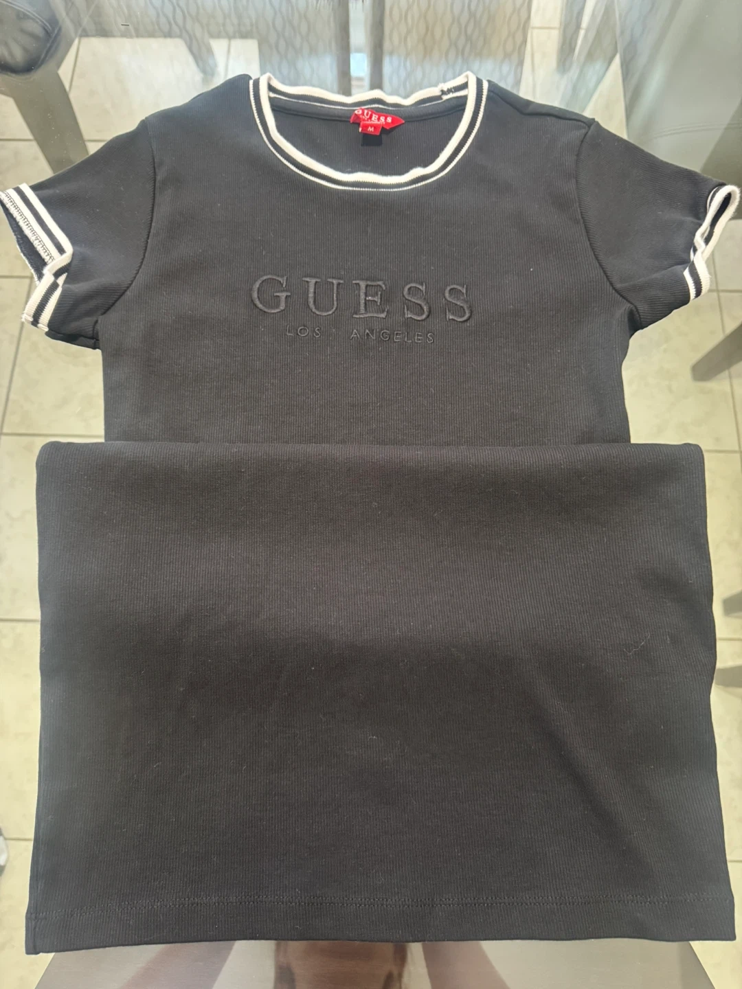 Selling a cute Guess black ribbed knit top and skirt set! The top has a stylish white trim around the neck and sleeves. Perfect for a casual yet chic look. Used once