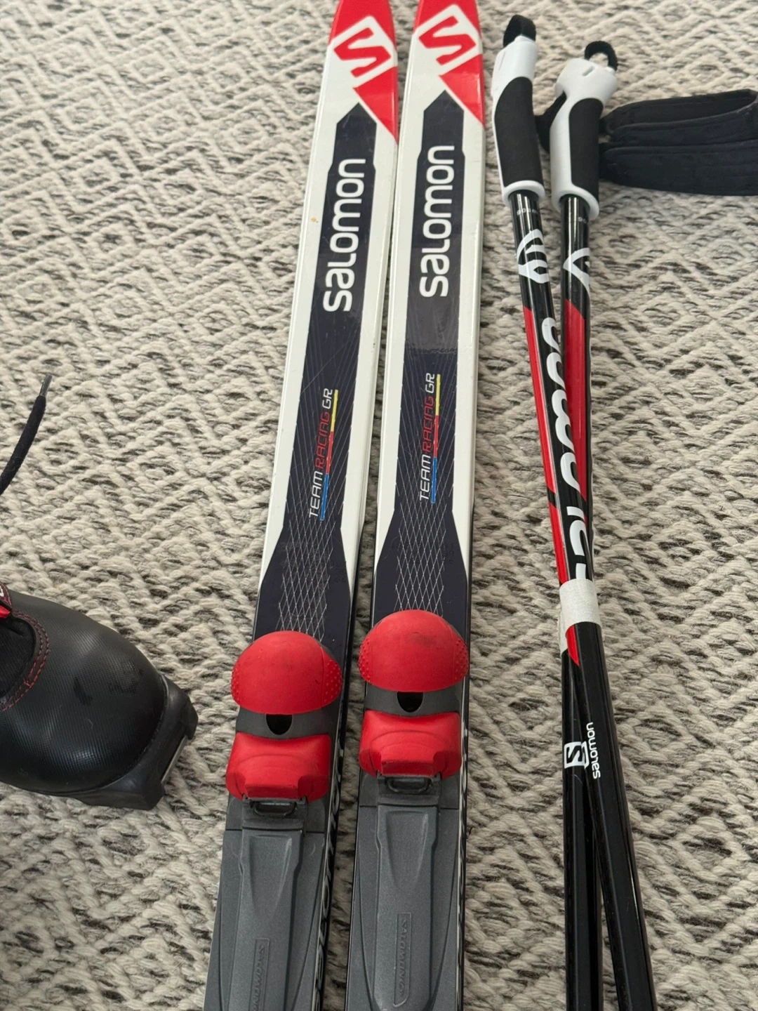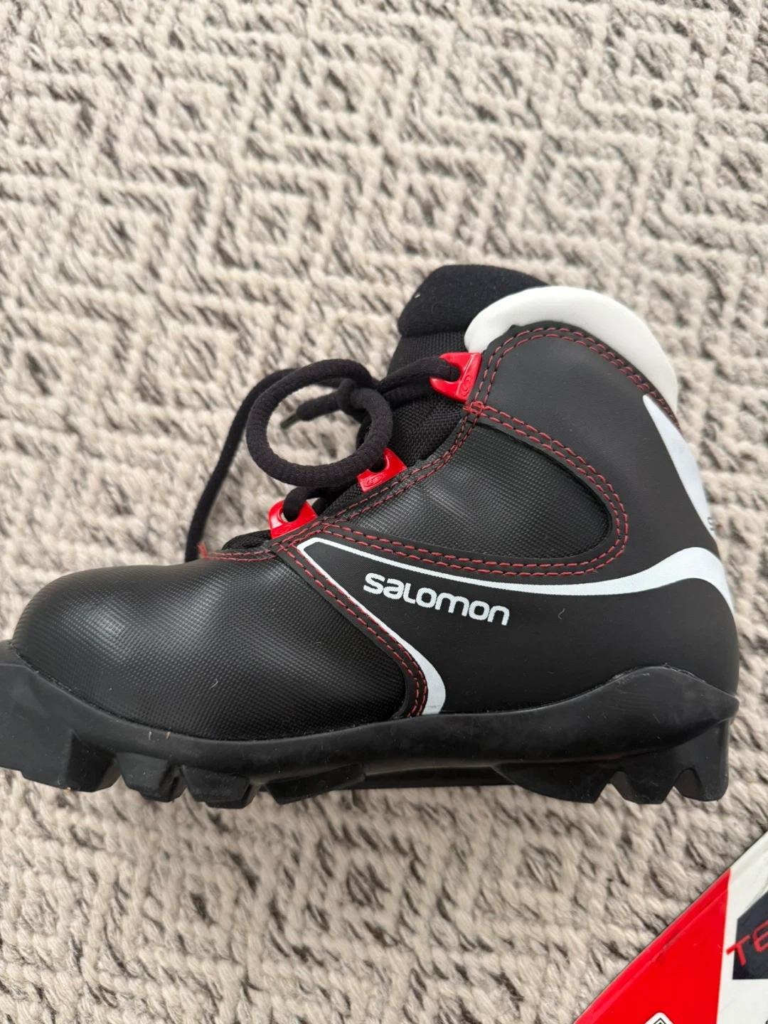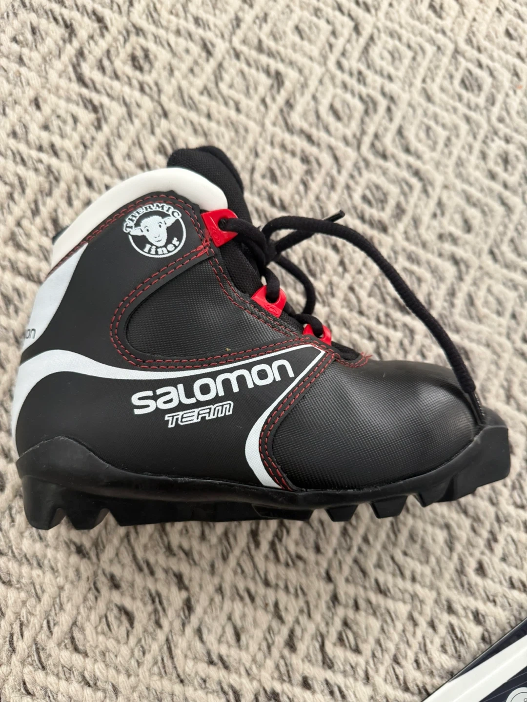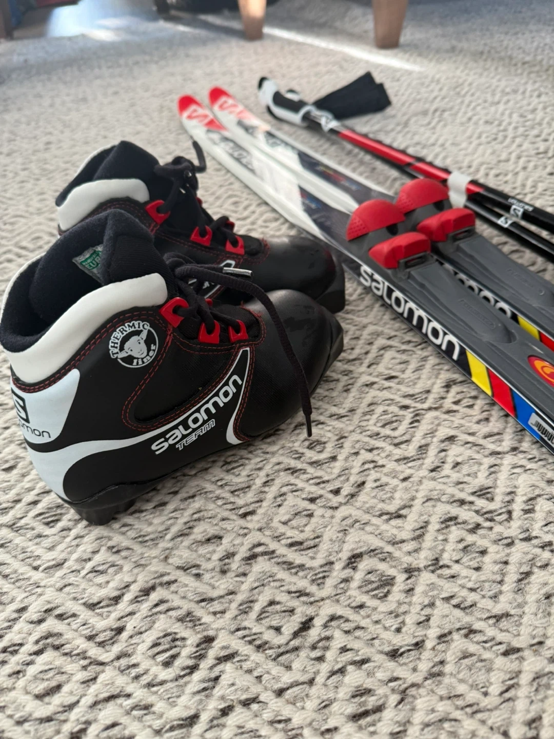 Selling a pair of Salomon Team Classic junior ski boots in size 12K, extra warm! Along with skis and poles. These boots are perfect for young skiers looking to cross-country ski this season. They feature a black, white, and red design.
