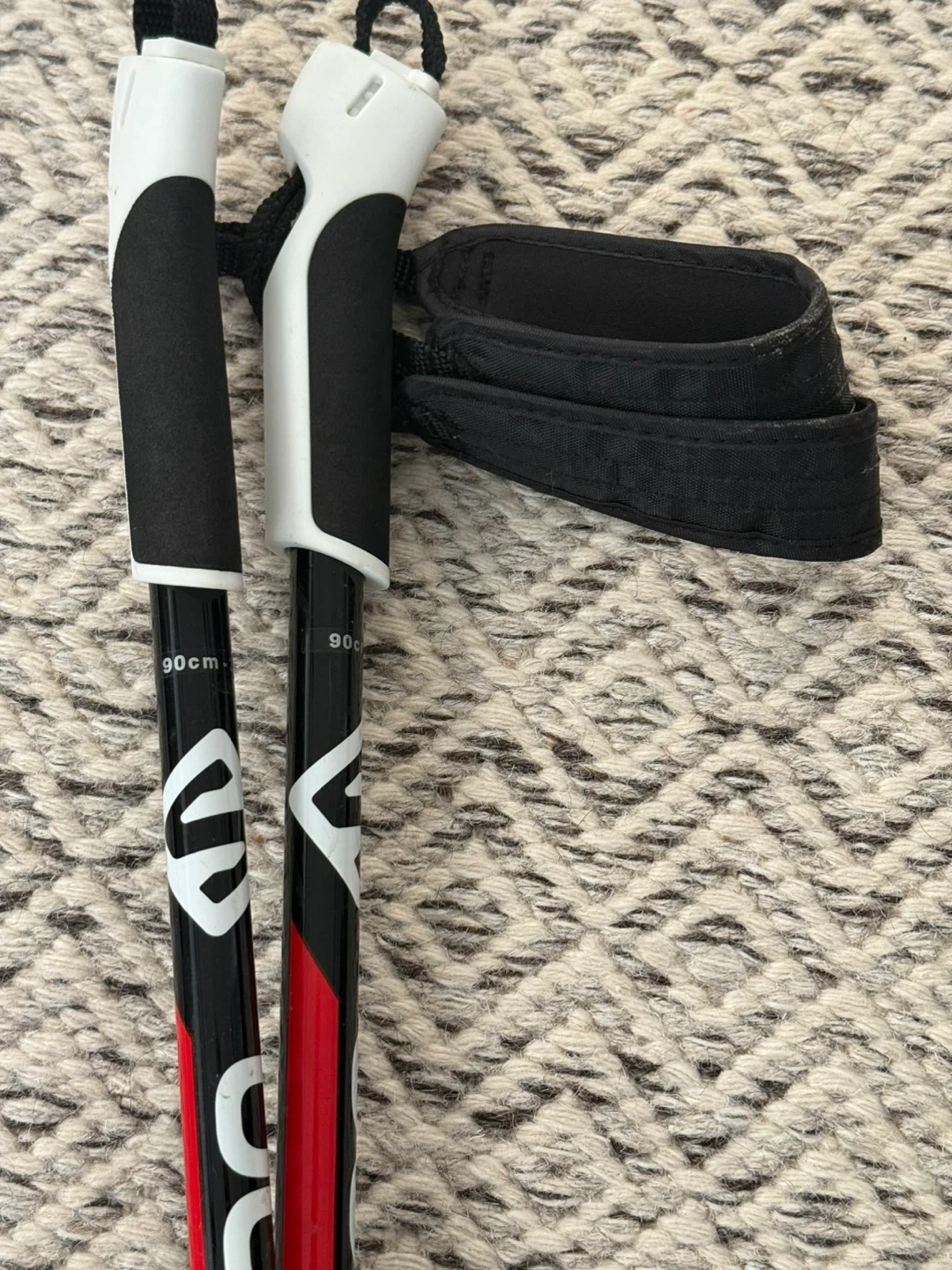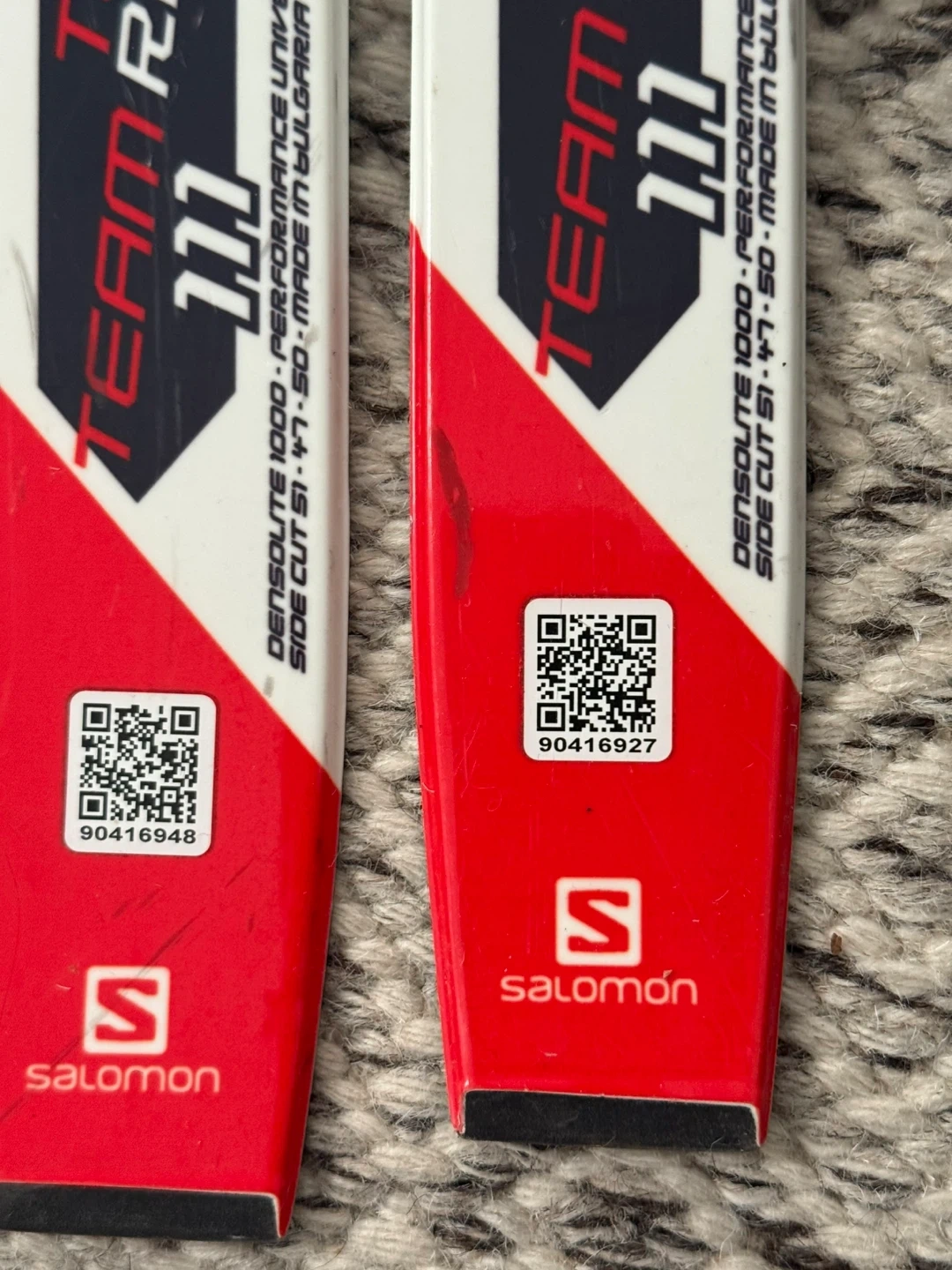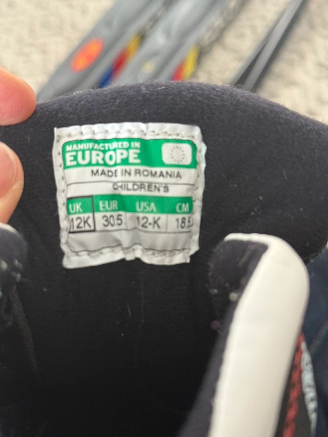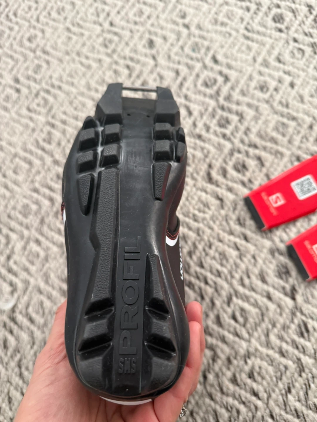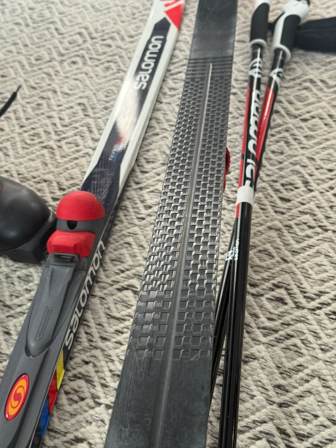 Selling a pair of Salomon Team Classic junior ski boots in size 12K, extra warm! Along with skis and poles. These boots are perfect for young skiers looking to cross-country ski this season. They feature a black, white, and red design.