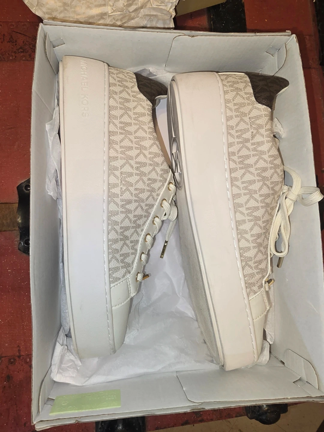 Selling a pair of Michael Kors Poppy Lace Up sneakers in US size 9.5M! They come in the original box and are in great condition. The colour is vanilla and they feature the MK signature design. These stylish sneakers are ready for a new owner!