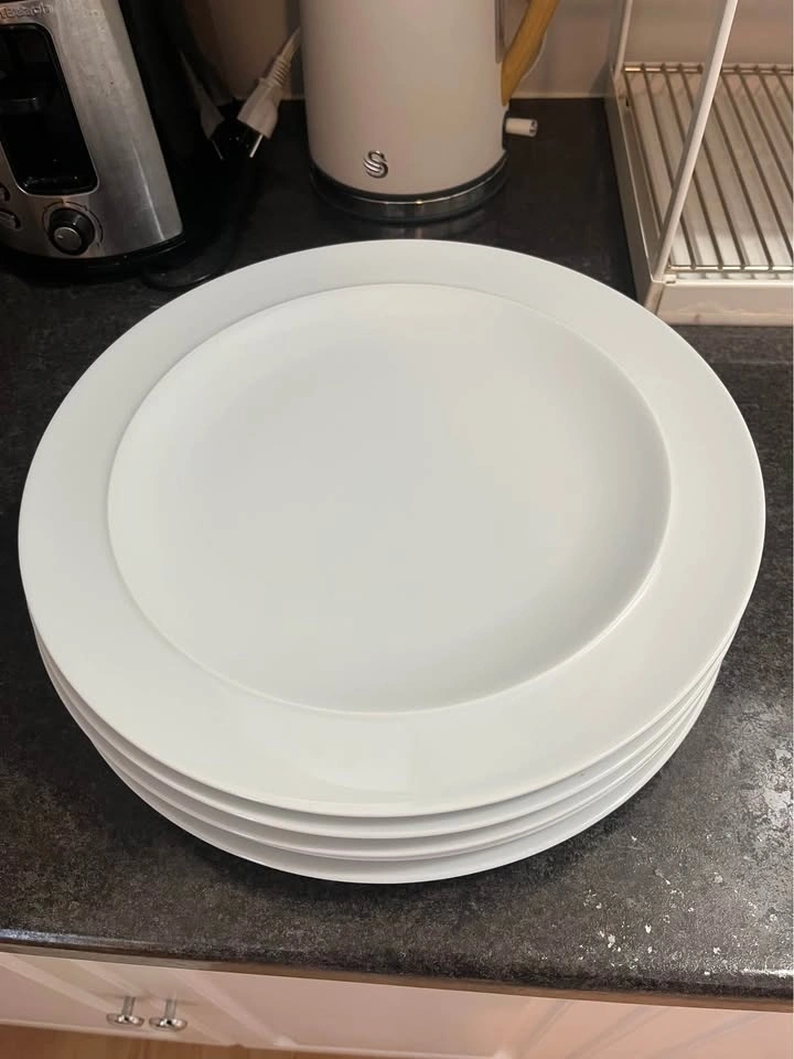 Five medium plates from Denby’s White collection. Made from heavy, high quality porcelain. Excellent condition. The inner rim is about 9.5” in diameter. 1” depth.