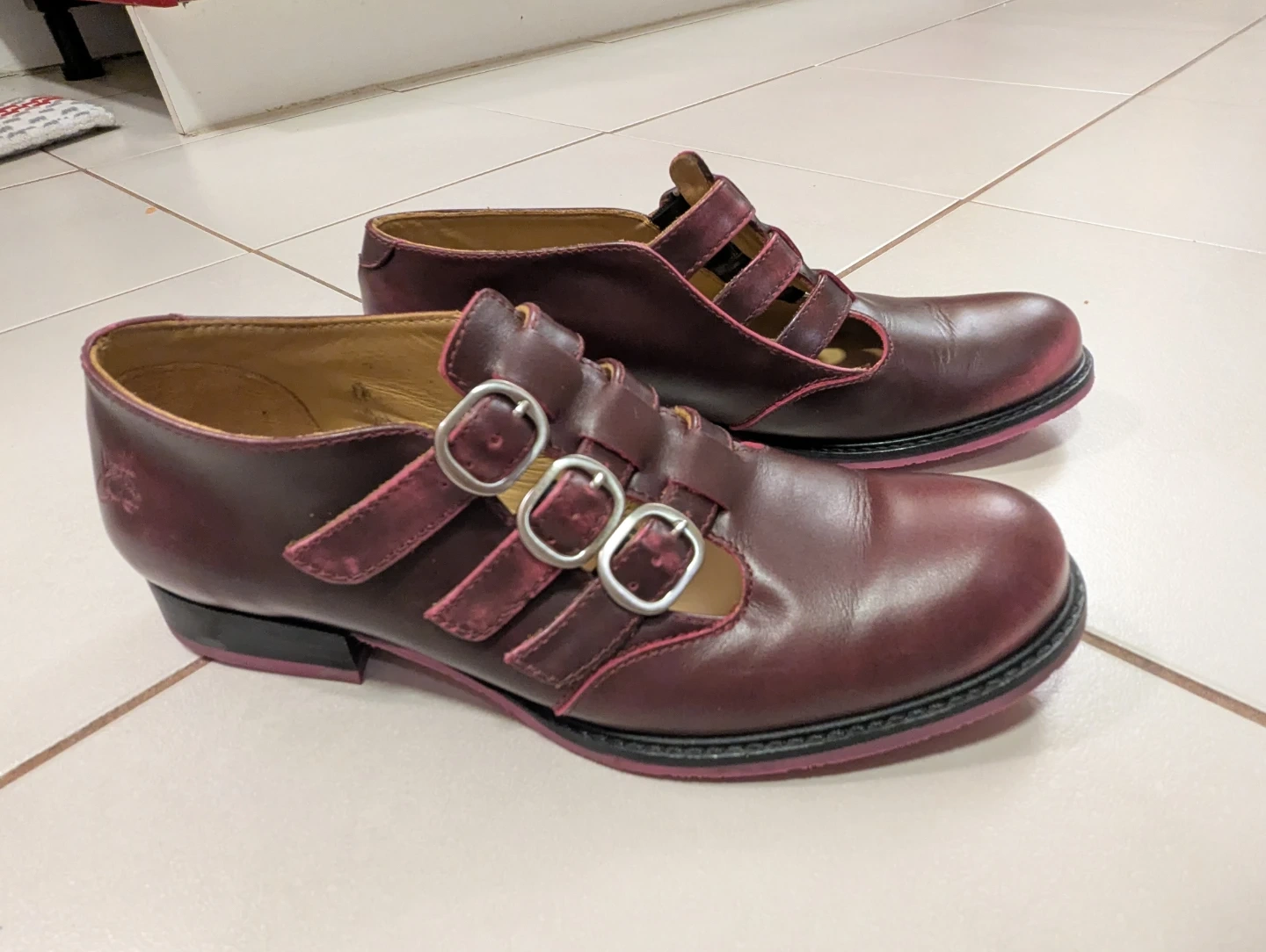 These shoes have a purposeful aged look with pink undertones and a burgundy overtone. Signature pink soles, 3 adjustable buckles, and leather uppers.