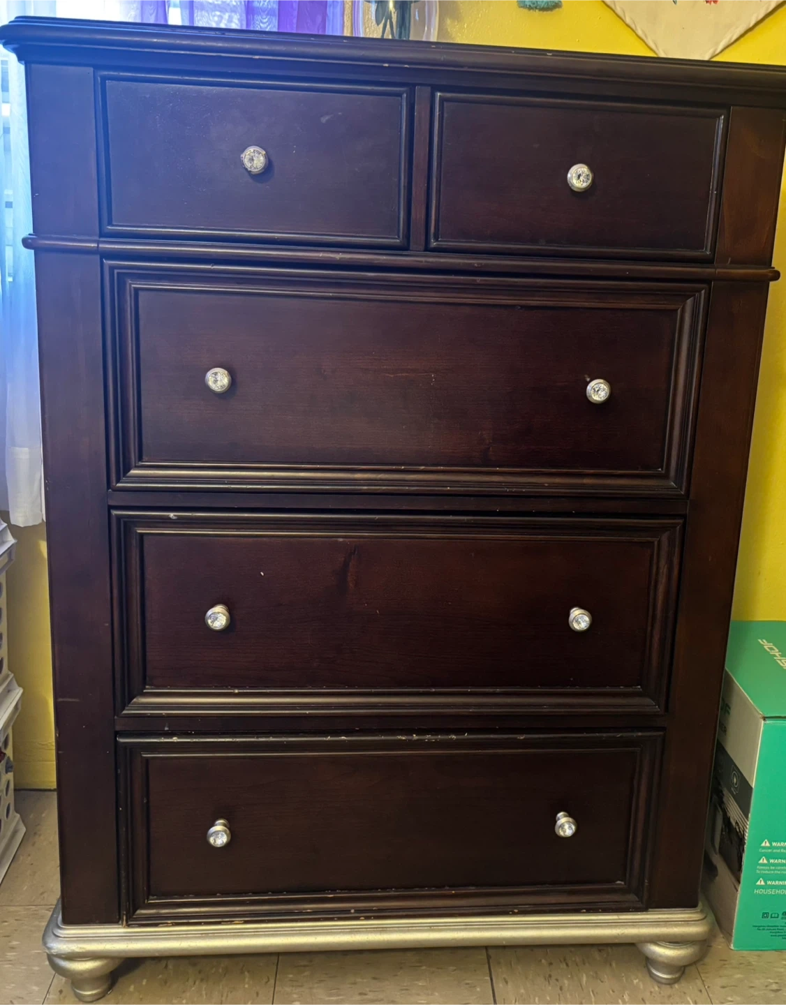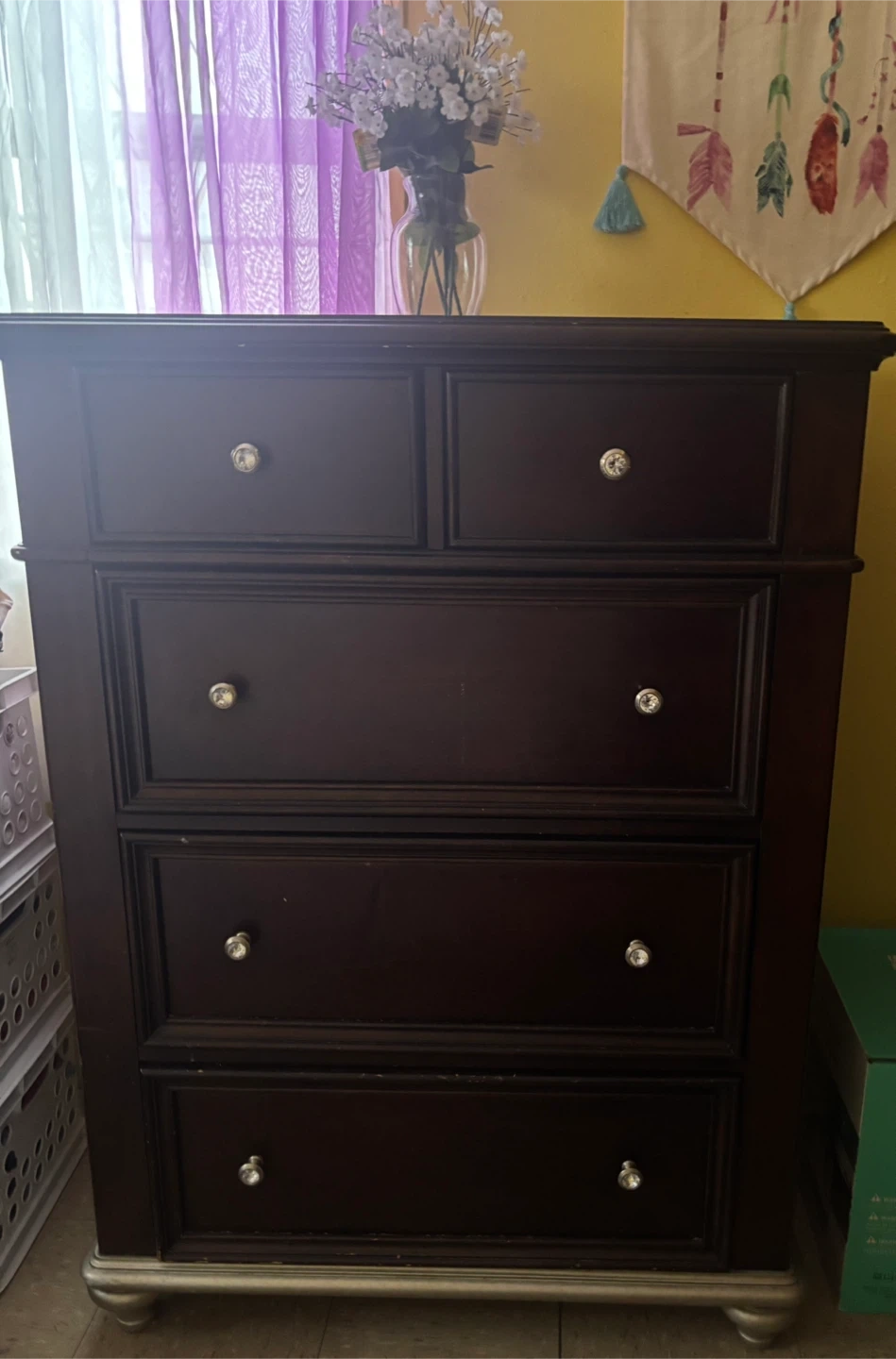 Selling a lovely dark wood 5-drawer chest. It's in great shape and ready to add some storage to your space! It features five drawers, perfect for organizing your clothes and other items. The dark cherry wood finish gives it a classic and elegant look.