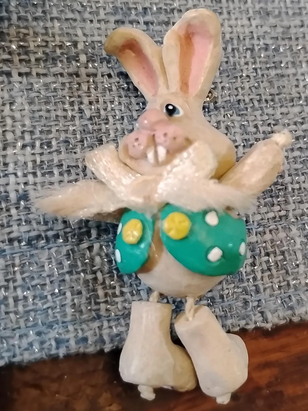 This is a cute bunny rabbit pin brooch in good condition! It features a white bunny with a green polka dot outfit and a bow. Perfect for adding a touch of whimsy to your outfit