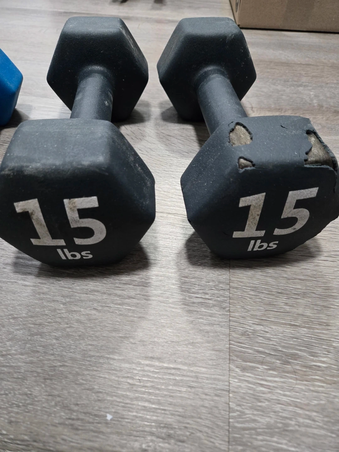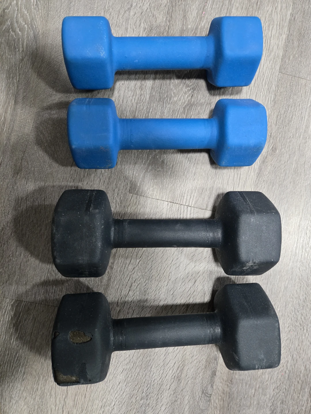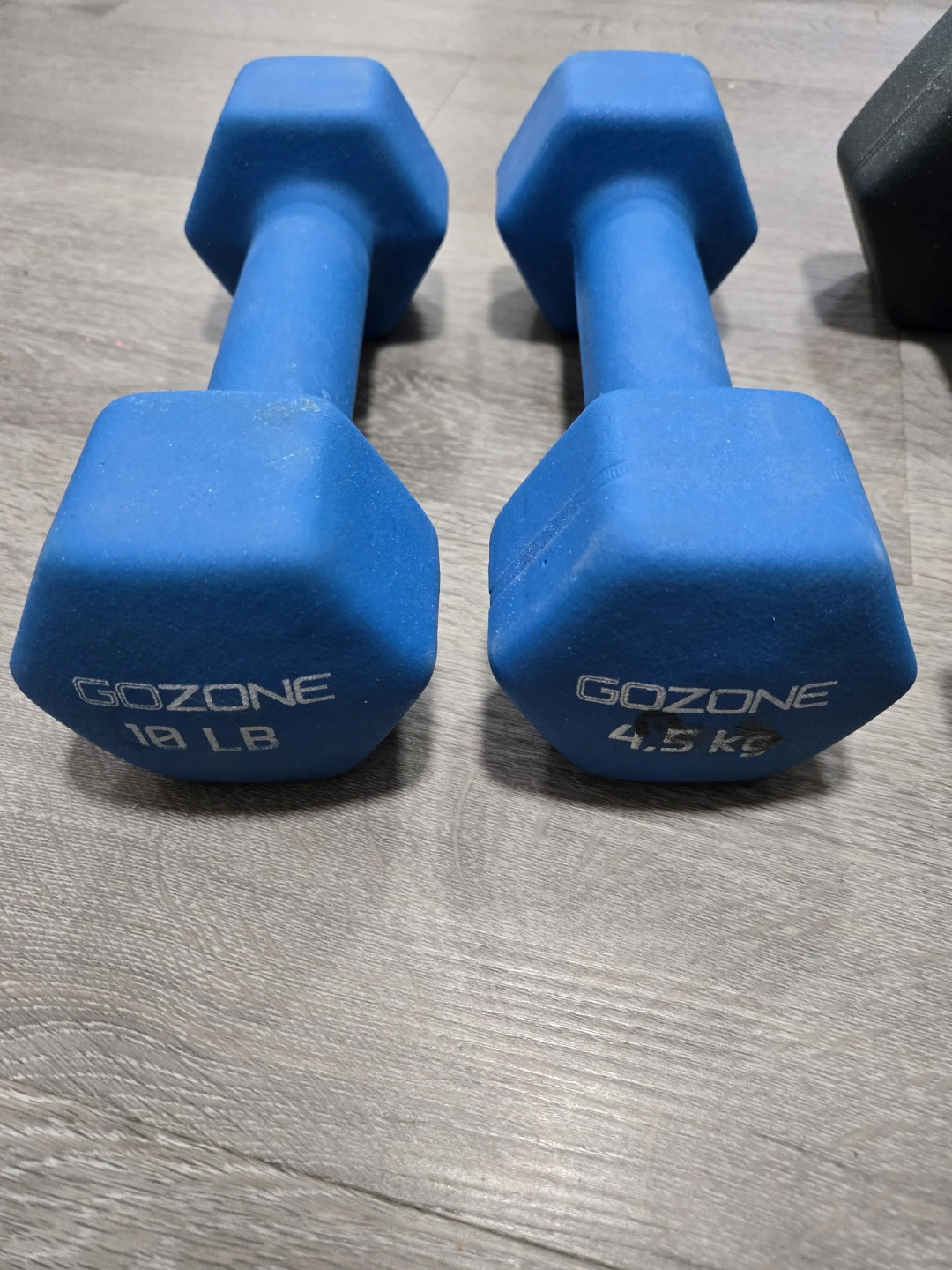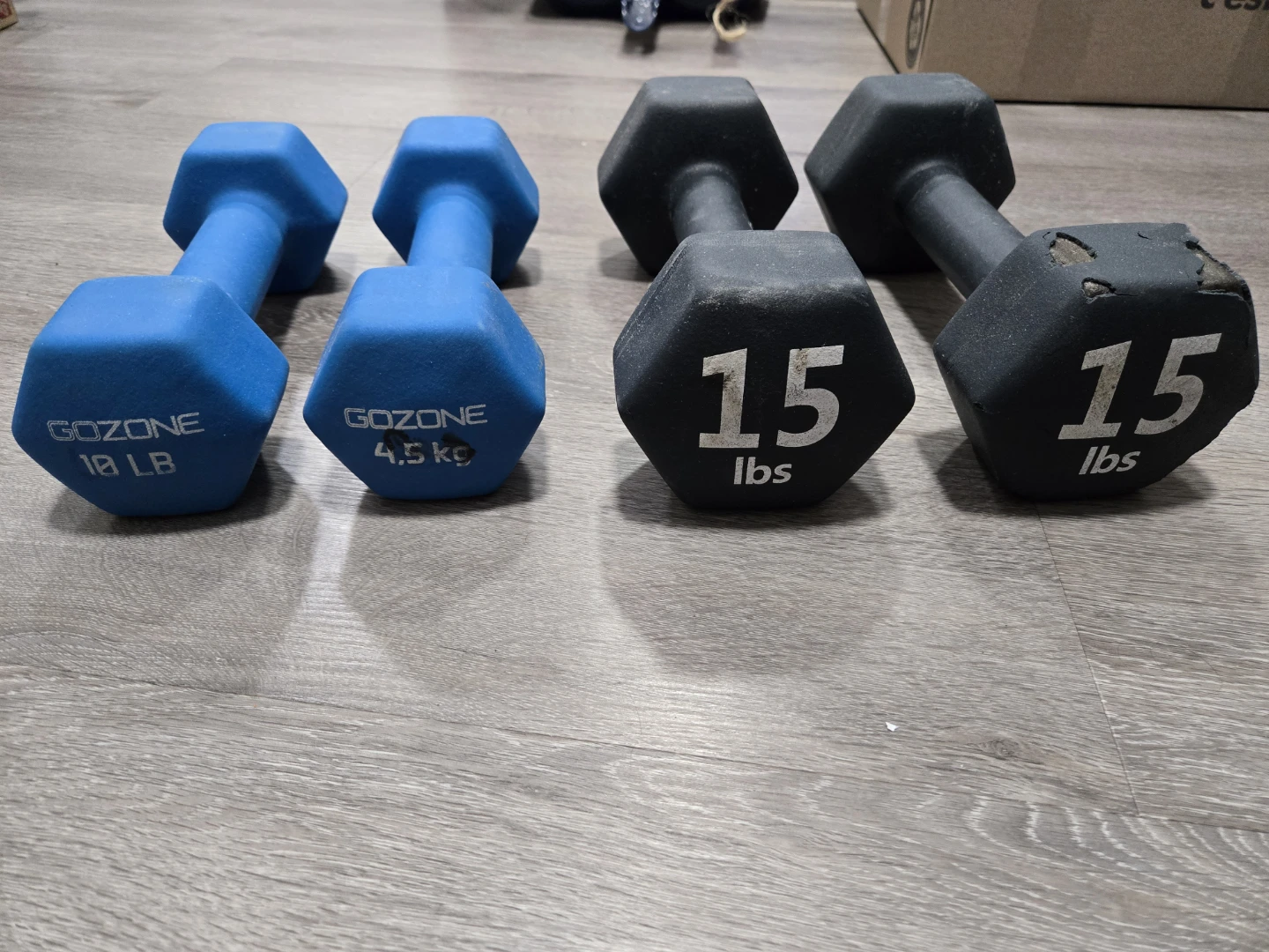 Selling a set of GoZone and Jogi dumbbells! Includes one pair of blue 10 LB dumbbells and one pair of black 15 LB dumbbells. They're in good used condition and ready for your home gym! One or the 15lb has some wear on tear on the rubber cover, but still functional.
