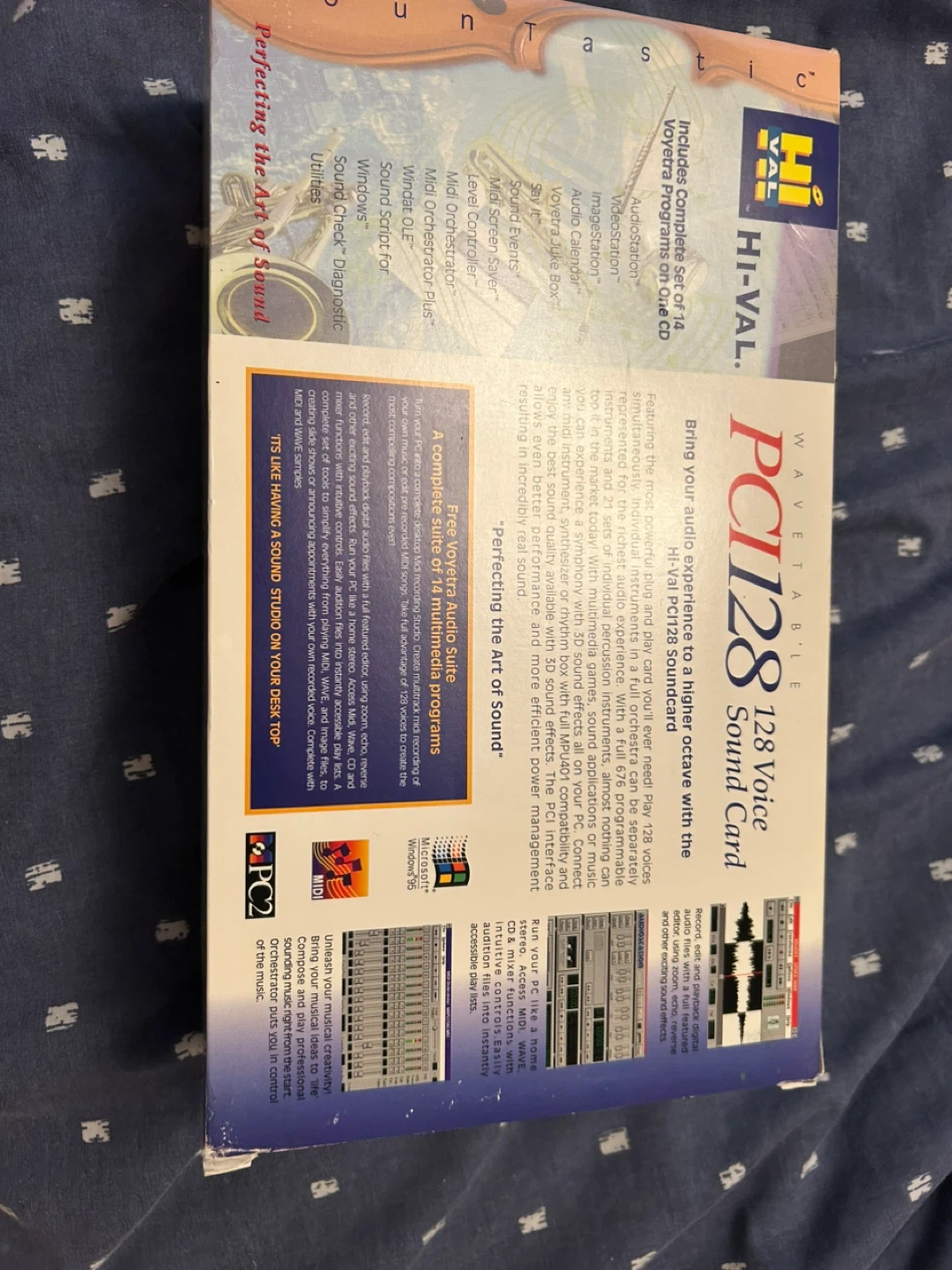 Selling a Hi-Val PCI128 Wavetable Sound Card. This card features high-quality wavetable synthesis with 128 voices and 616 programmable instruments and 21 drum sets. It meets the requirements for PC98 and supports full duplex playback and record. Also includes complete set of 14 Voyetra Programs on one CD