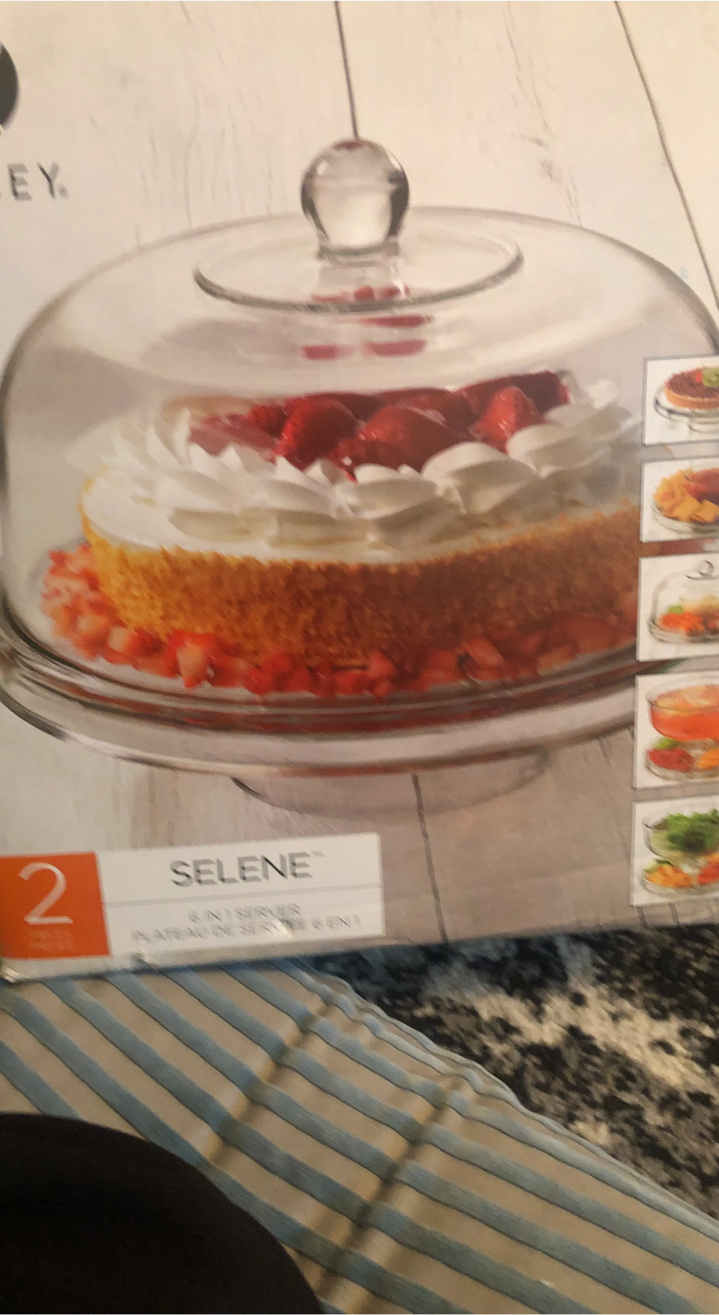 Selling a Selene 6-in-1 server platter with a dome lid. It's perfect for serving cakes, appetizers, or salads. This versatile platter can be configured in multiple ways to suit your needs. Great for parties and gatherings!