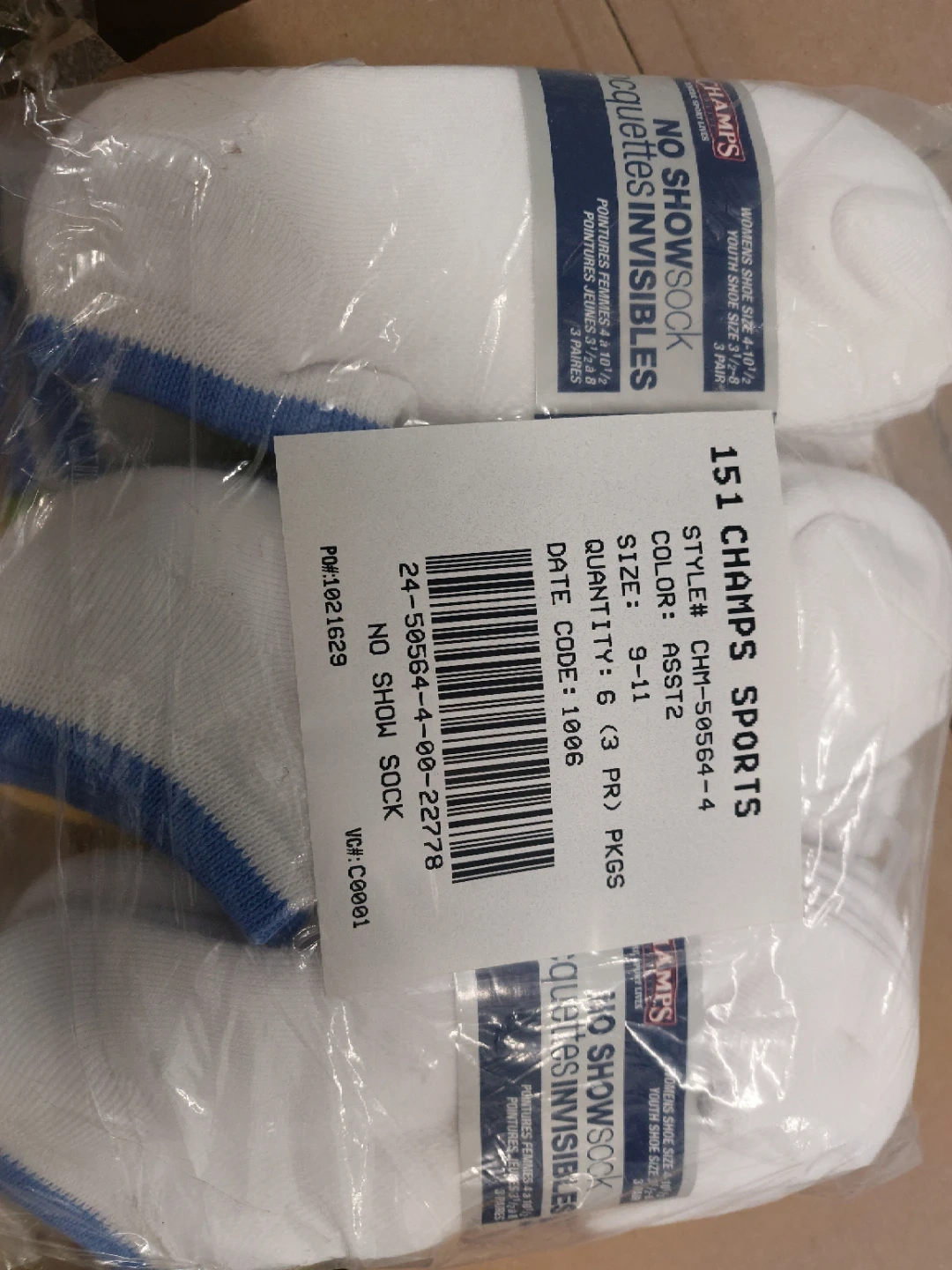 Selling a pack of Champs Sports no-show socks for youth. The size is 9-11, and the pack contains 6 pairs of socks. They're white with blue and yellow accents. Perfect for keeping those little feet comfy! Total of 18 Pairs inside