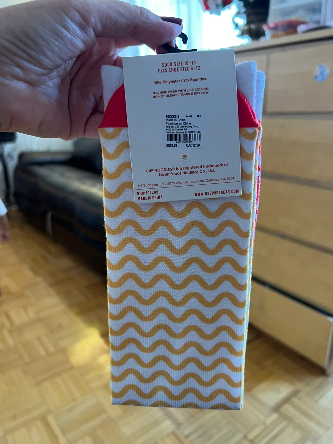 These fun Nissin Cup Noodles crew socks are size 10-13, fitting shoe sizes 8-12. They're made of 98% polyester and 2% spandex, so they're nice and stretchy. Originally CAD$12.50