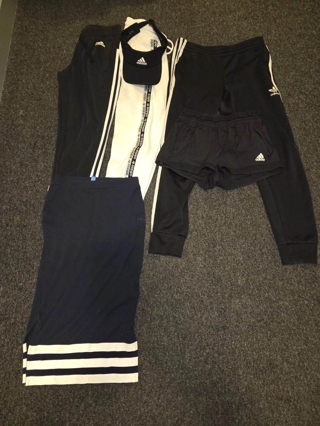 Selling a bundle of Adidas clothing items! Includes a mix of pants, shorts, and a visor. All items are in good condition and ready for a new owner