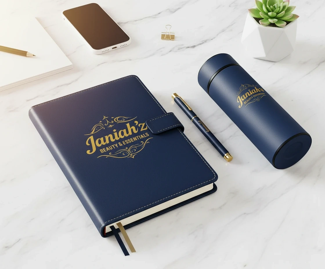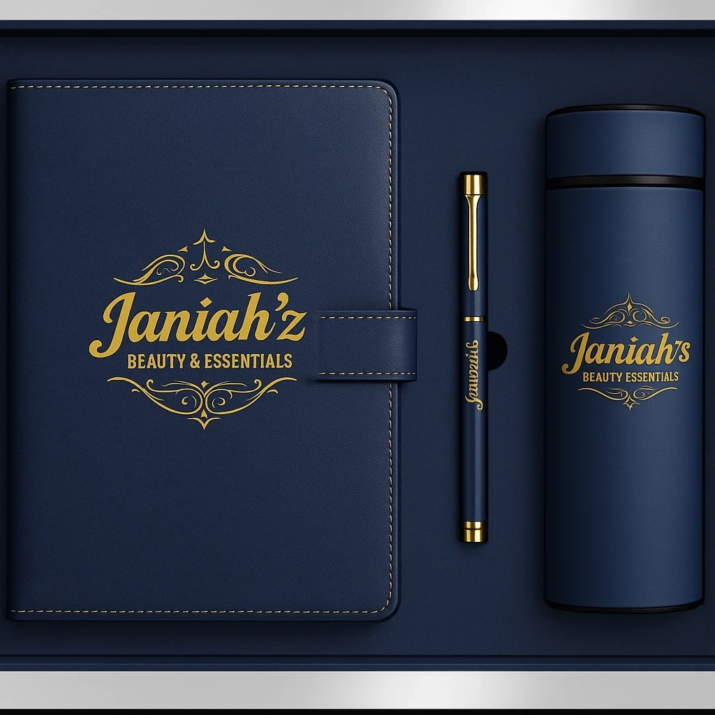 I'm selling a new Janah'z Beauty & Essentials gift set! It includes a notebook, pen, and tumbler, all beautifully coordinated. The set comes in a box, making it perfect for gifting. custum your name on it.