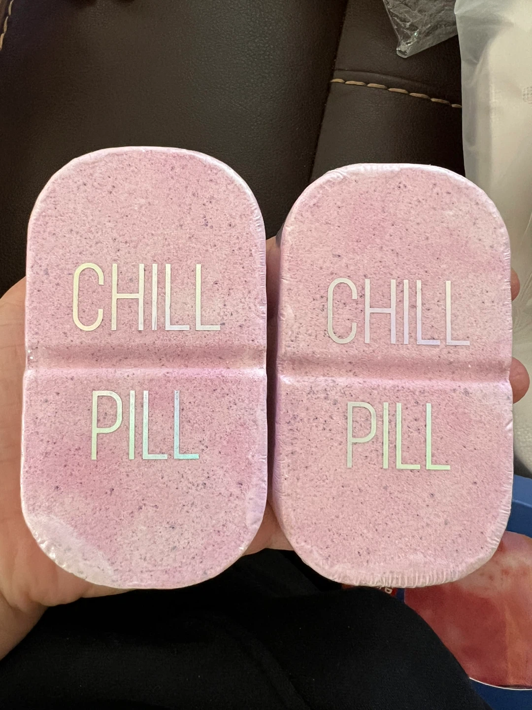 Selling two new Chill Pill strawberry scented bath bombs! Each bath bomb weighs 150g/5.32oz and retails for $9.99 USD/CAD12.50