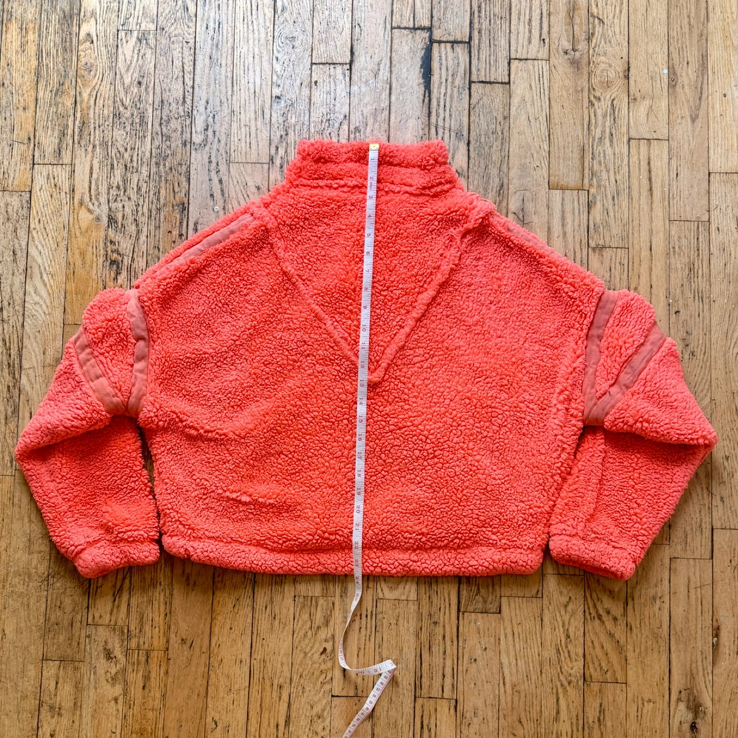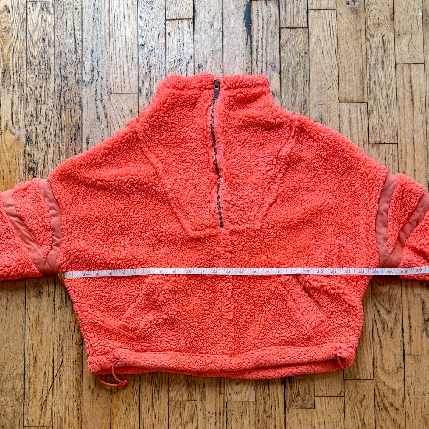 Drawstring cord waistband. Super cozy and very warm. Cropped, fits oversized.