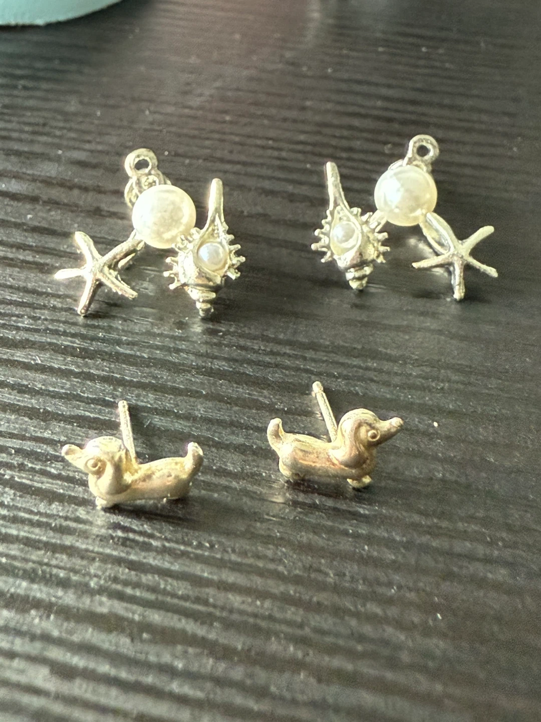 Here's a fun set of earrings! You get two pairs: one with adorable dachshunds and another with a seashell, starfish, and pearl design. Perfect for adding a little whimsy to your look