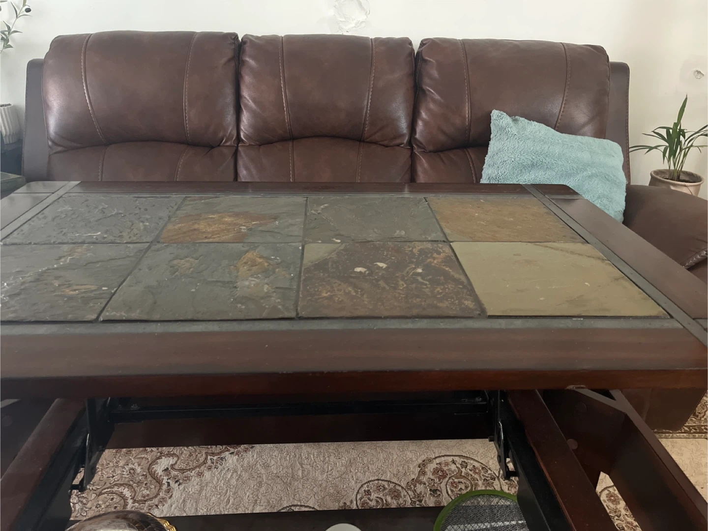 This is a high-quality solid wood coffee table featuring a beautiful slate tile top and a lift-top design that raises for eating, working, or extra convenience.