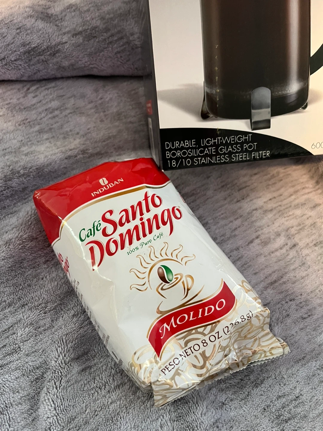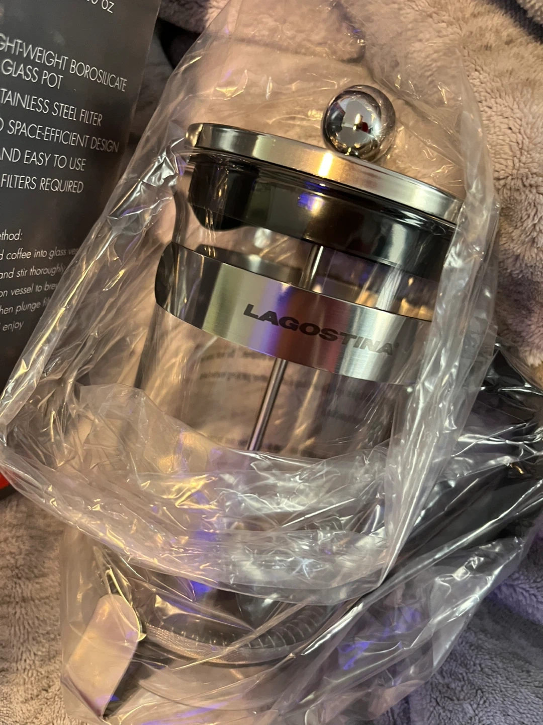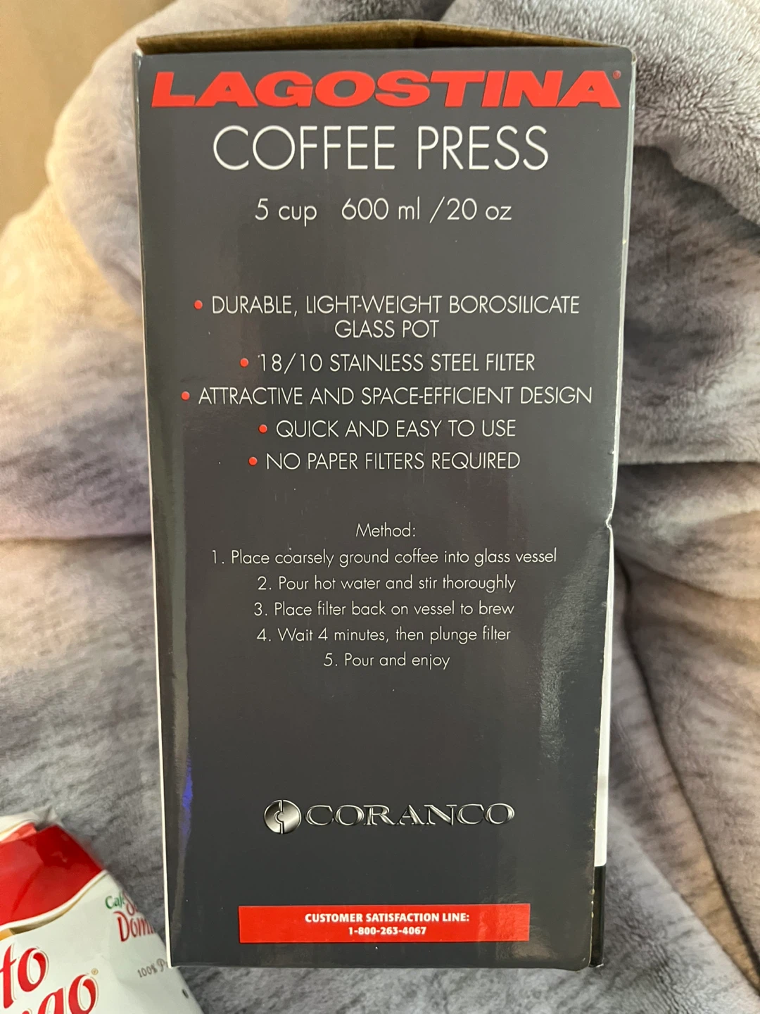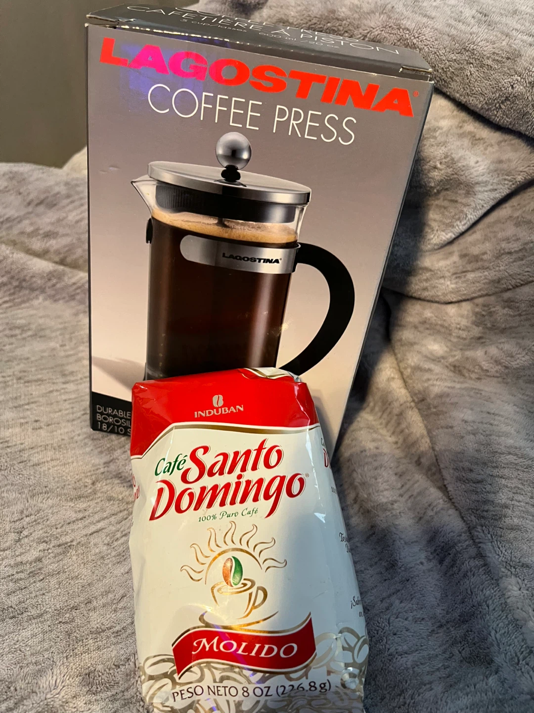 Glass Lagostina 5 cup coffee press with silver metal and black accents - new. Coffee from the Dominican Republic, 8oz/226g.