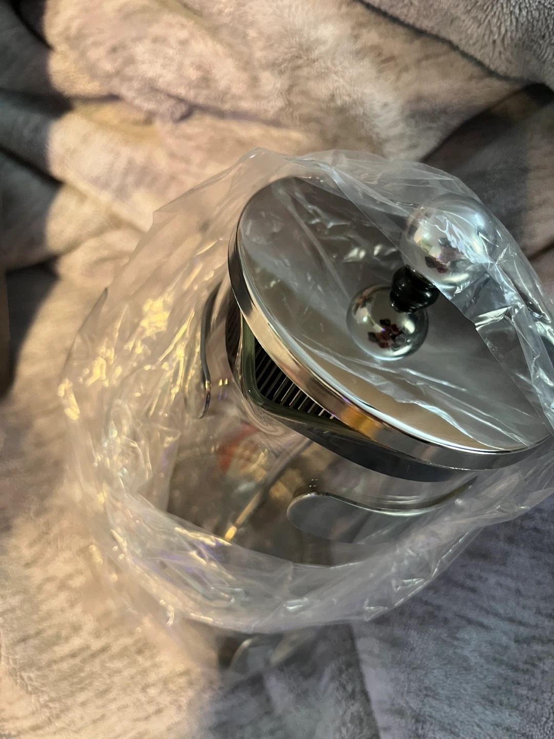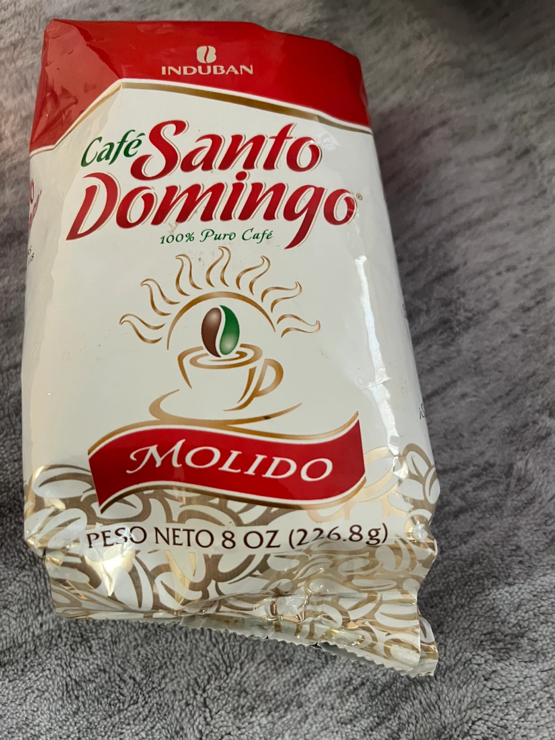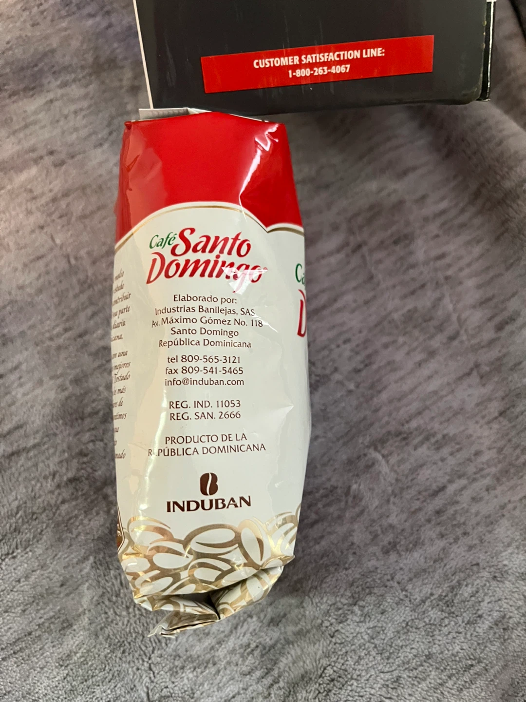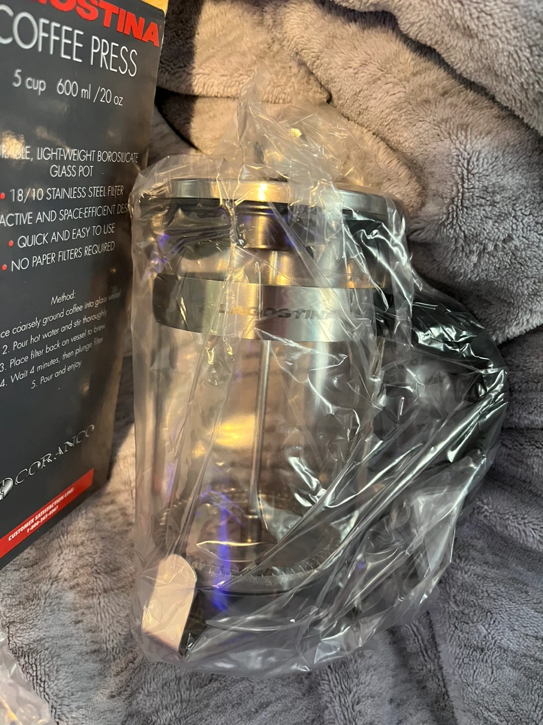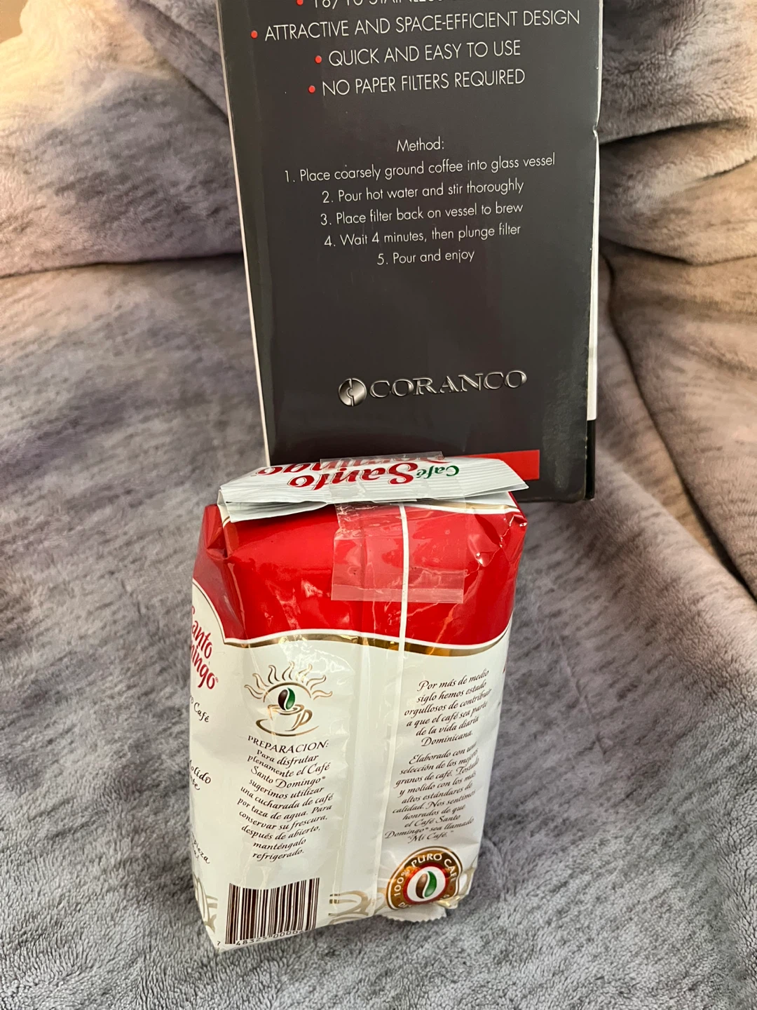 Glass Lagostina 5 cup coffee press with silver metal and black accents - new. Coffee from the Dominican Republic, 8oz/226g.
