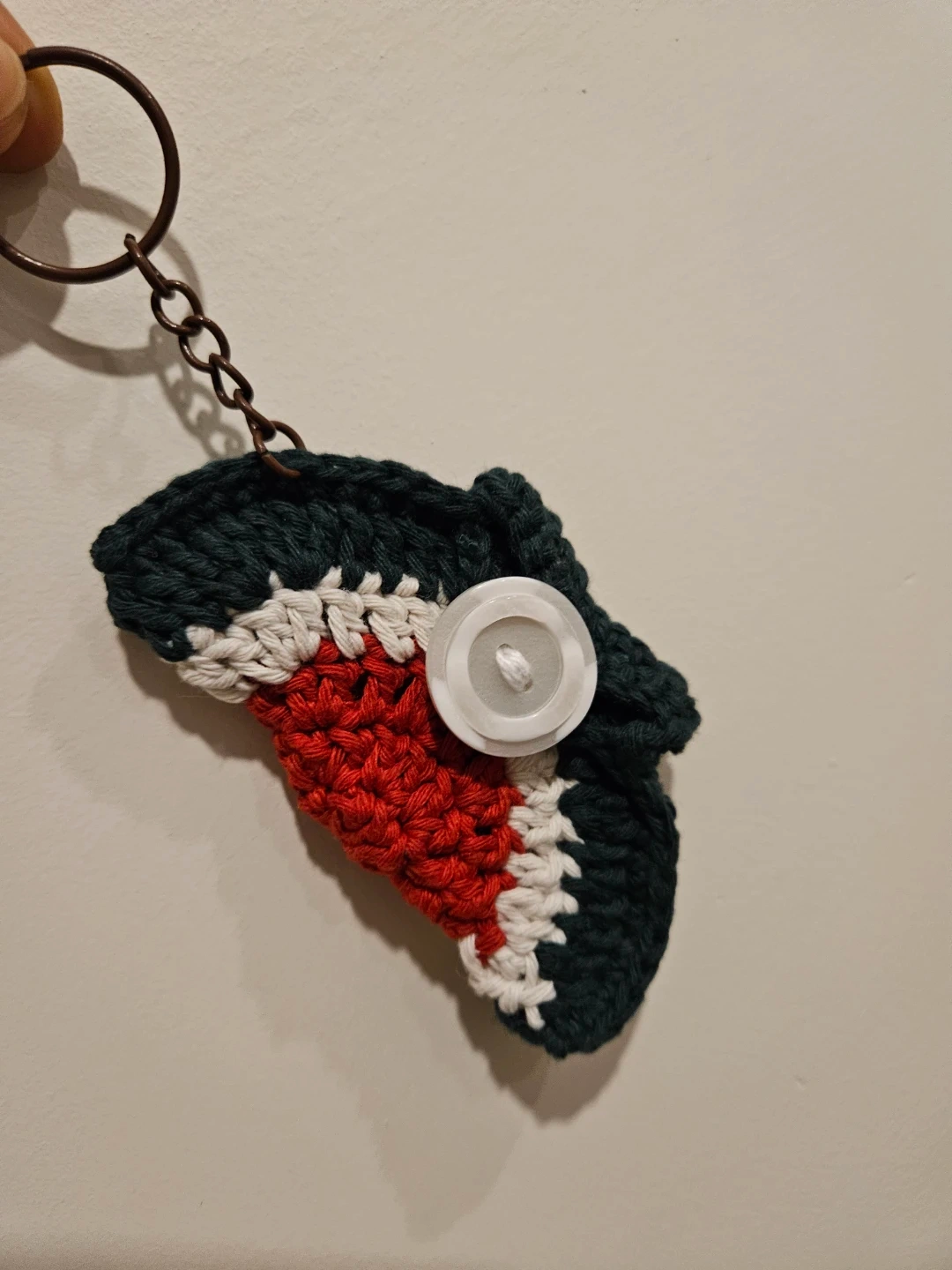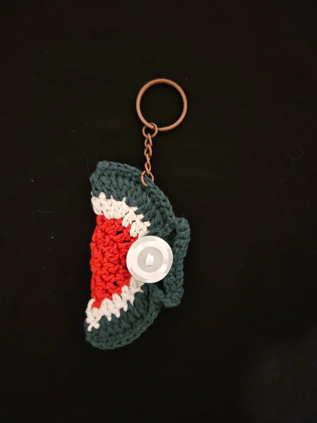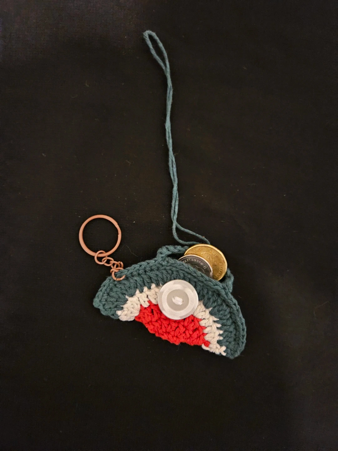 Check out this unique, handmade crocheted coin purse keychain! It's perfect for keeping your loose change handy and adding a touch of charm to your keys or bag. The colours are a mix of red, white, and green. Coins excluded.