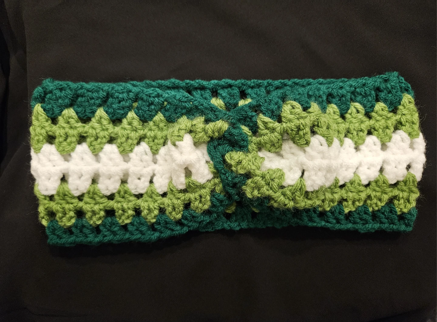 Selling a cute, handmade crocheted headband! It features a lovely green and white pattern. Perfect for keeping your hair back in style!
