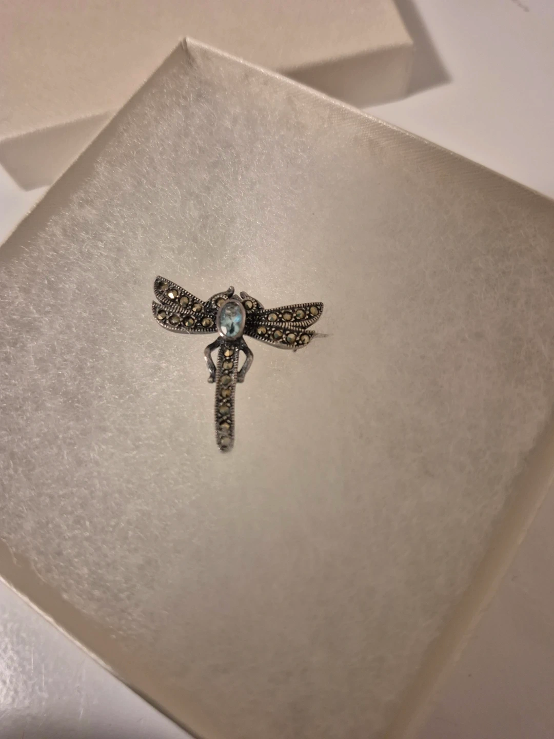 Selling a lovely vintage dragonfly pin brooch. It comes in a box and is in good condition. The stone is a blue aquamarine stone (March birthstone)! Perfect for adding a touch of vintage charm to any outfit!