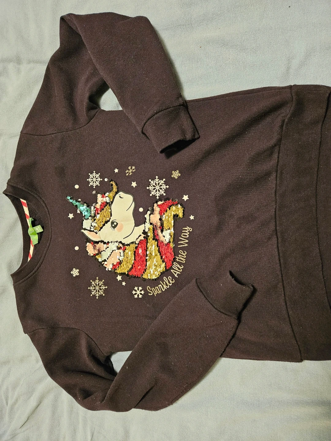 A cute brown sweater for girls! It features a sparkly sequin unicorn design with snowflakes and stars. The words "Sparkle All the Way" are embroidered on the front. Perfect for the winter season!
