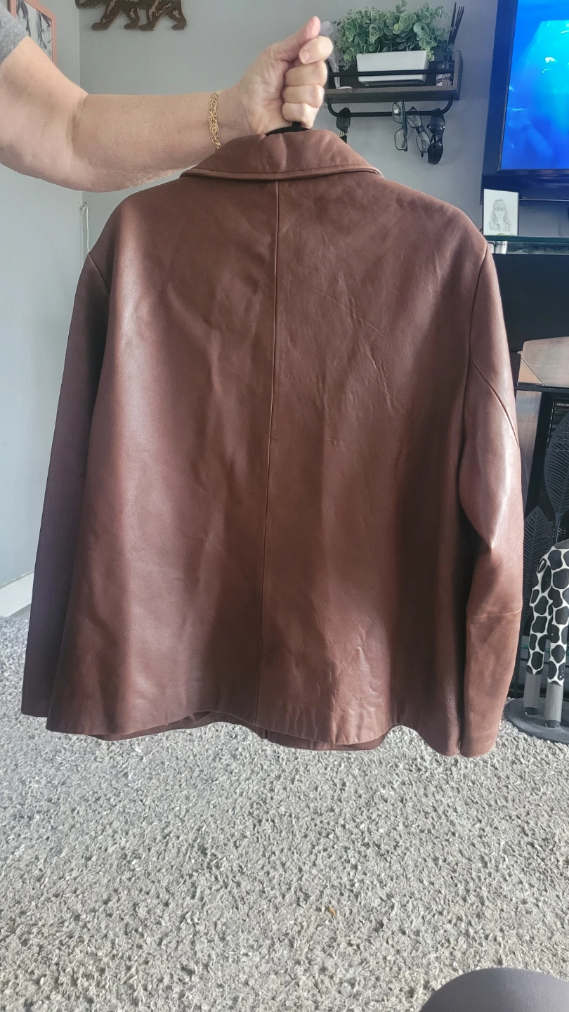 Eddie Bauer genuine lamb leather jacket in size XXL. The lining is 100% polyester. It's a beautiful brown colour and in good condition!