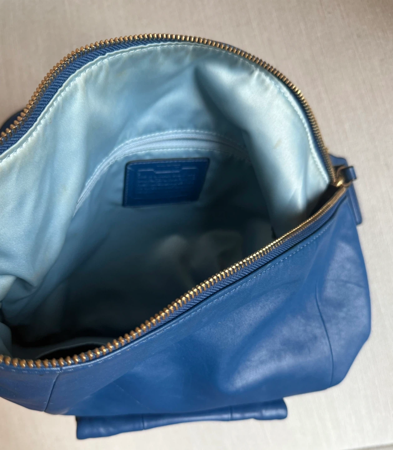 Selling a blue Coach leather hobo bag. It's a stylish and functional bag, perfect for everyday use. The bag features a zipper closure and a front pocket with a turn-lock closure. The interior is lined with a light blue fabric. It's in good condition and ready for a new owner!