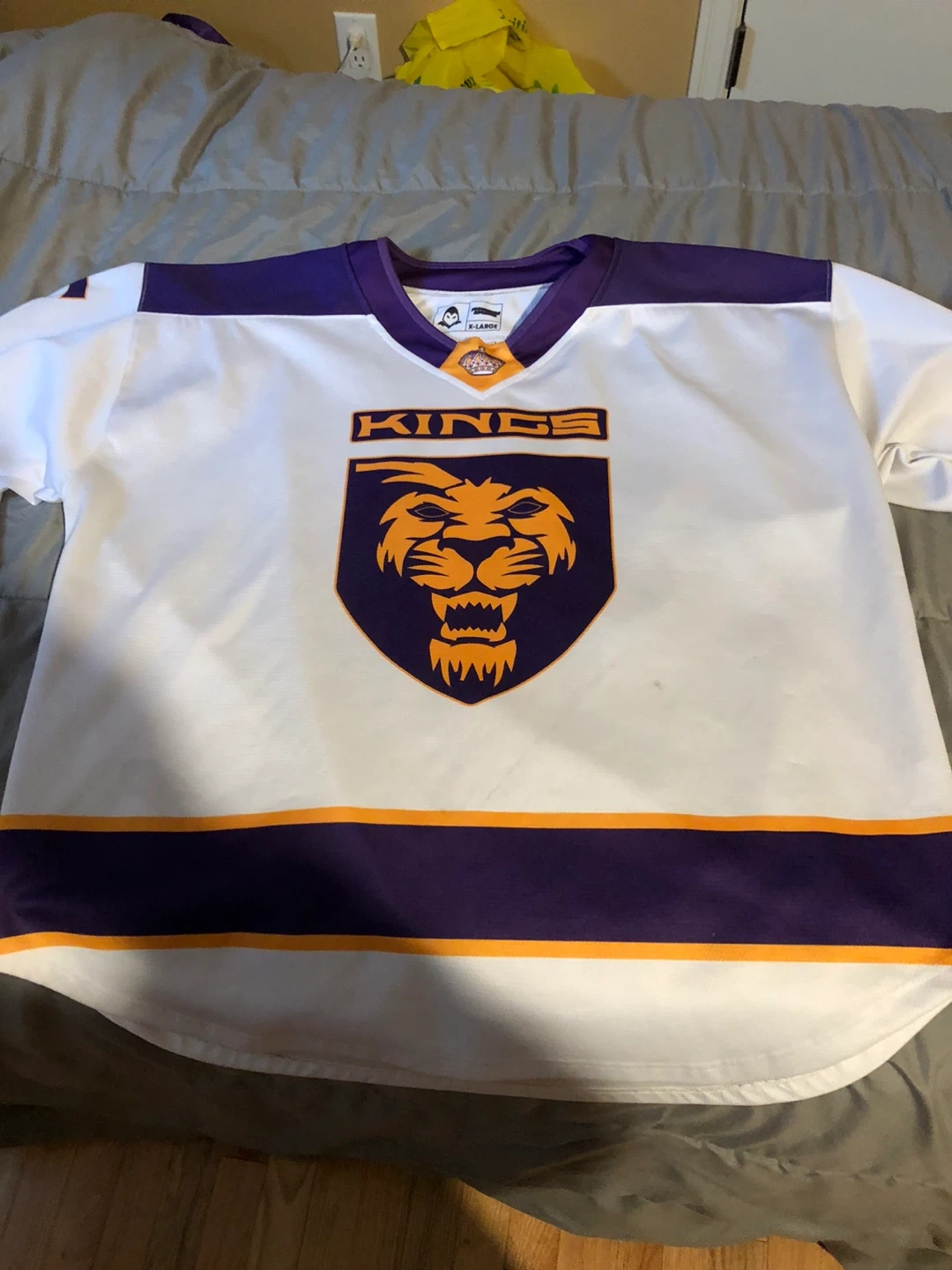 Selling a Phantom Sports Kings hockey jersey in size X-Large. It's white with purple and orange accents and features the number 66 on the back and sleeves. The Kings logo is prominently displayed on the front.