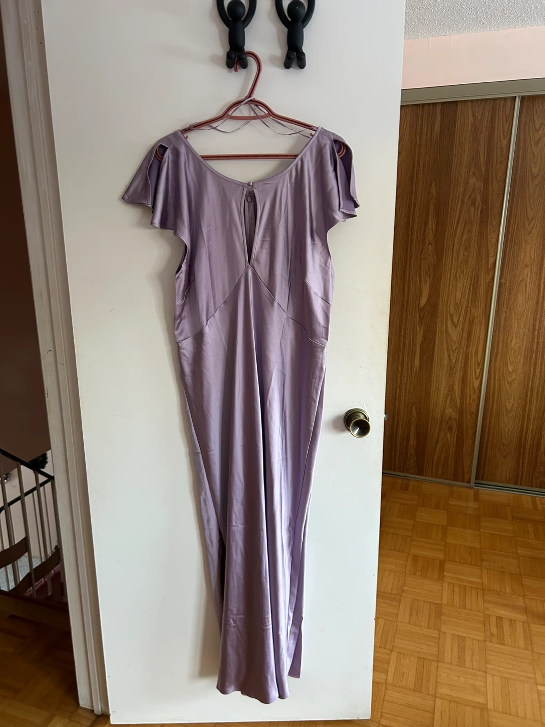 Selling an Old Navy 'The Occasion' flutter-sleeve keyhole satin maxi dress in a beautiful lilac / light purple colour. Has a zipper back, flutter shoulder sleeves, and a keyhole slit in the front. Size women’s XL.