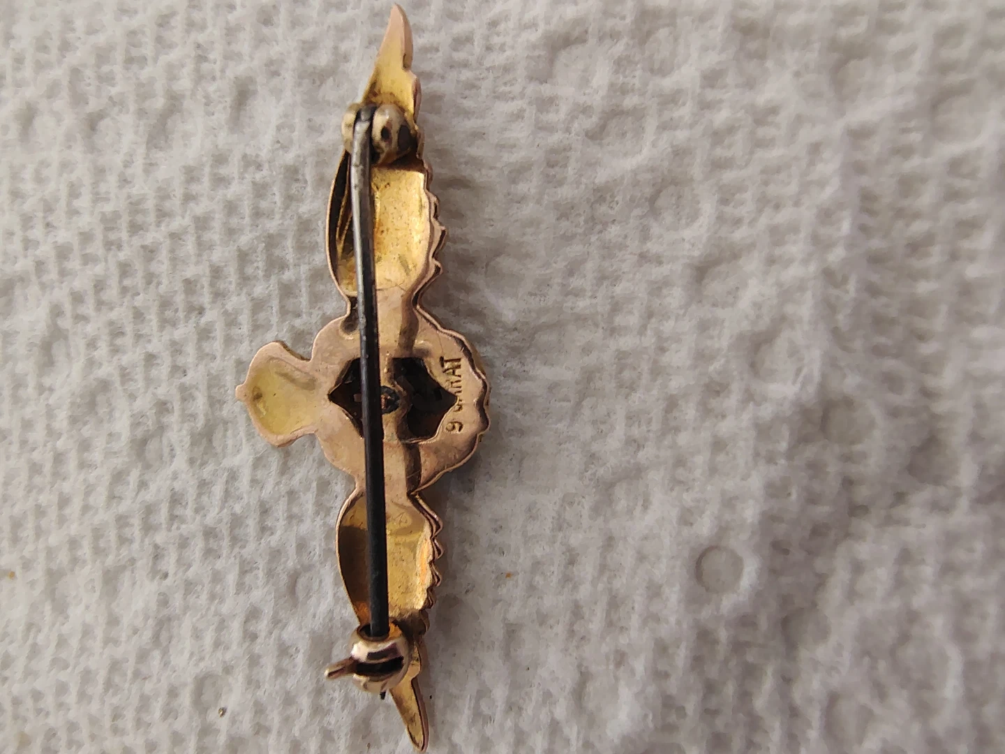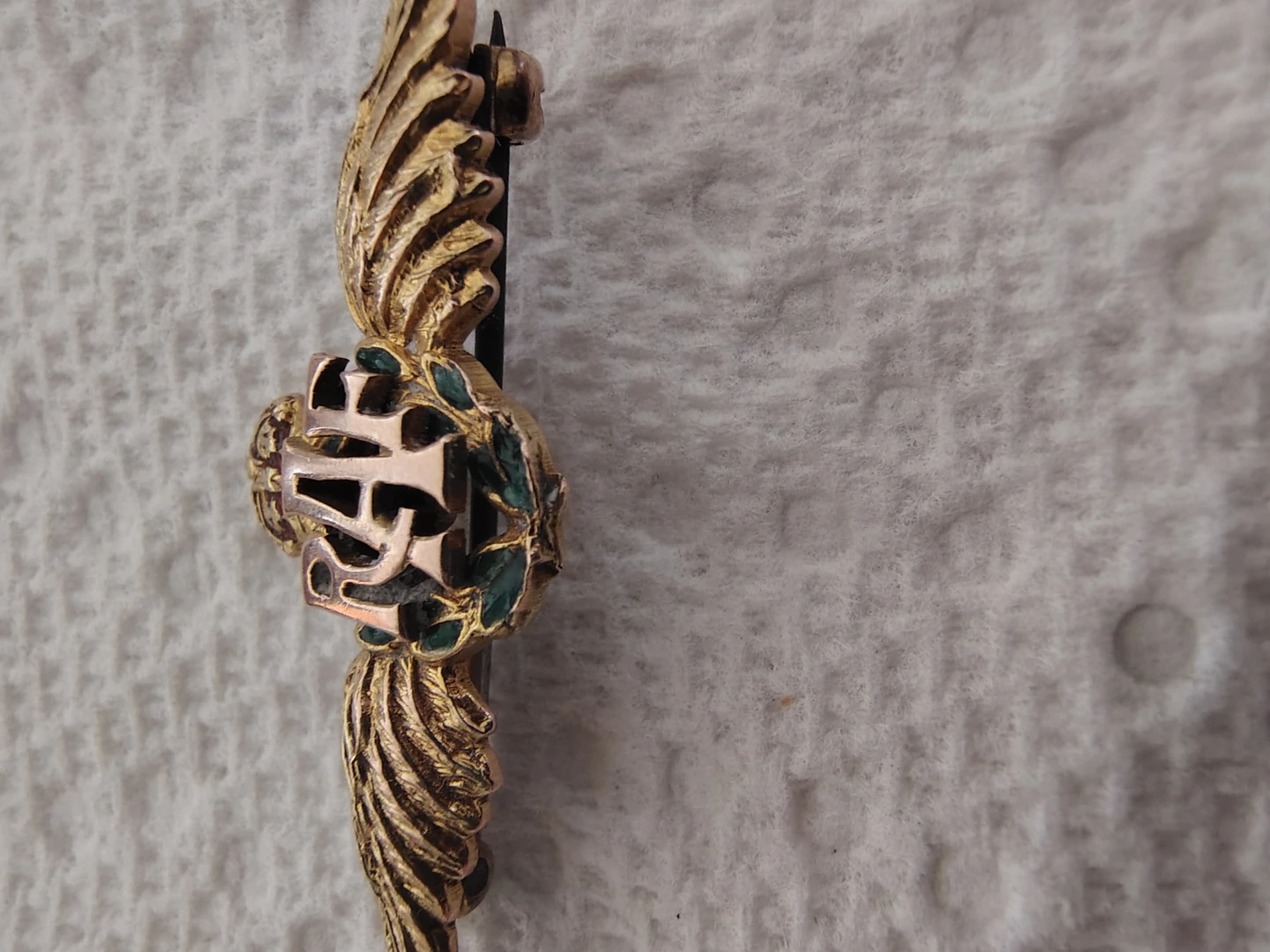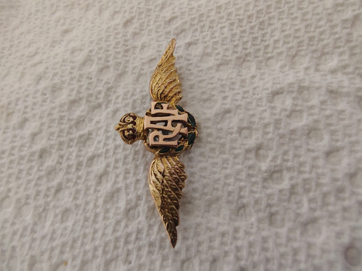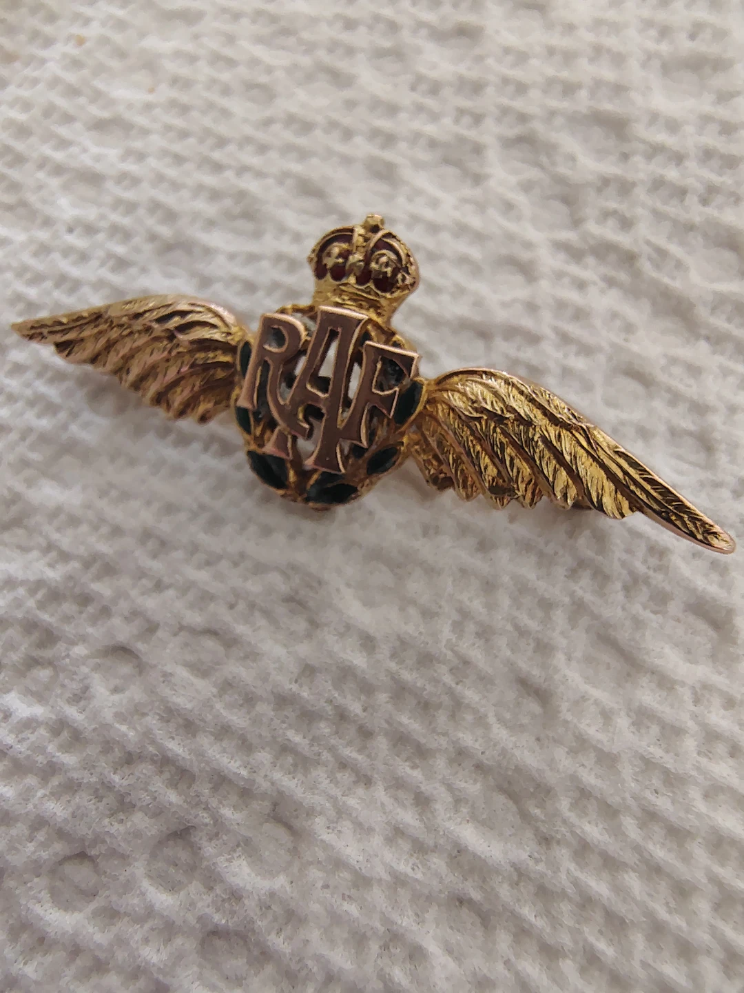 This is a wonderfully unique and very pretty RAF sweetheart pin from the WWII era. It’s solid 9 carat gold, fully hallmarked, with a delicate green enamel detail on the laurels — the enamel is in perfect condition. The photos truly don’t capture how lovely this piece is in person.