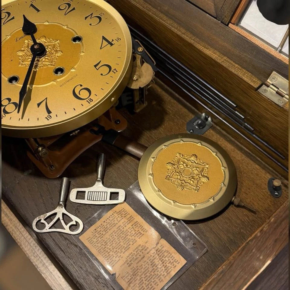 • Condition: Appears to be an older clock, offered with the pendulum bob, winding key, and what looks like the original limited warranty/care instructions.