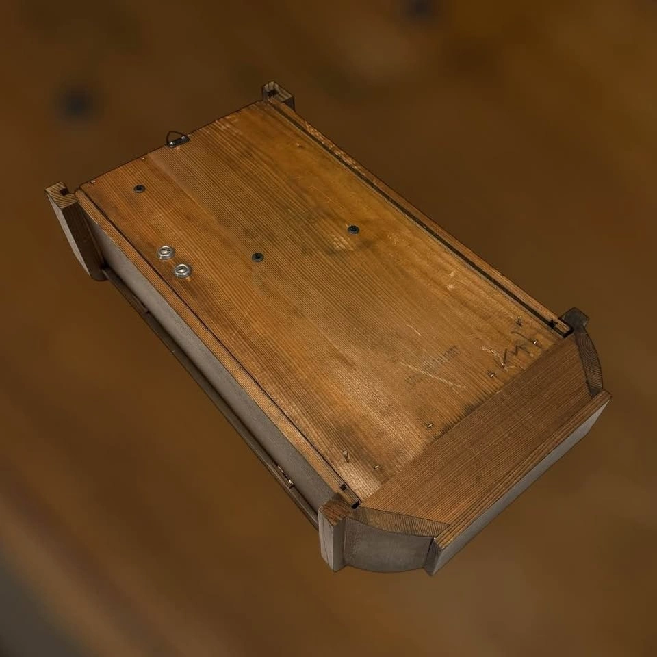 • Case Style: Traditional wooden wall-mounted case with carved top detail and a hinged front door for access to the mechanism and winding holes.