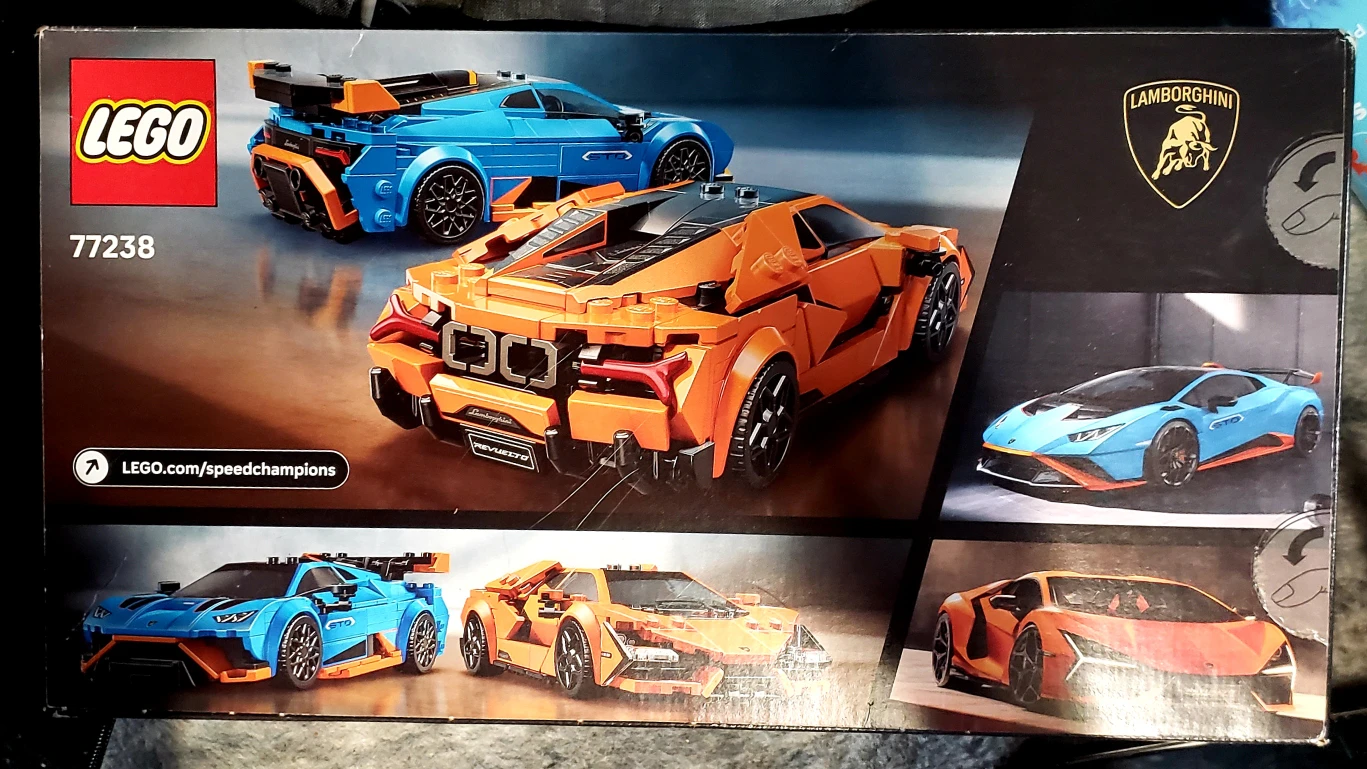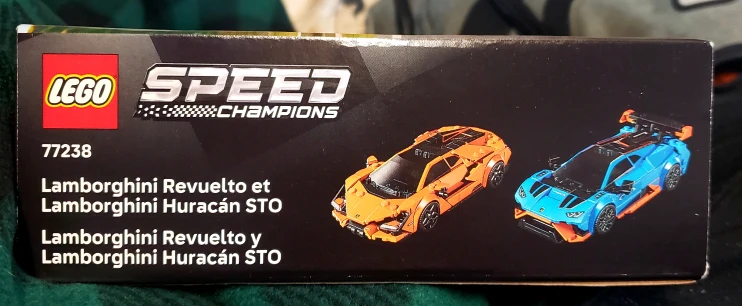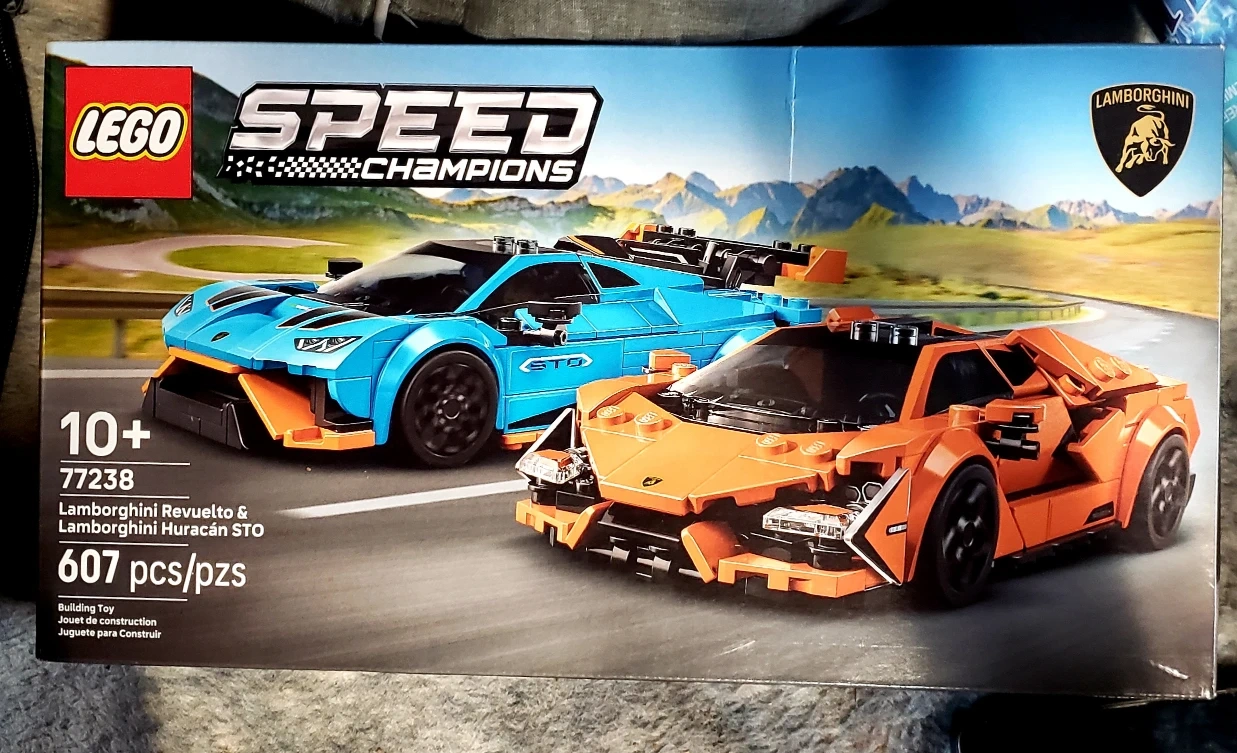 Selling a LEGO Speed Champions set featuring the Lamborghini Revuelto and Lamborghini Huracán STO! This set is number 77238 and includes 607 pieces. It's a great building toy for ages 10+
