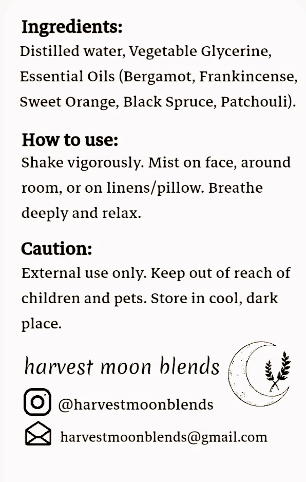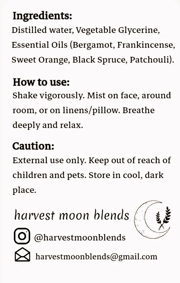 Ingredients: Distilled water, Vegetable Glycerin, Essential Oils (Bergamot, Frankincense, Sweet Orange, Black Spruce, Patchouli).