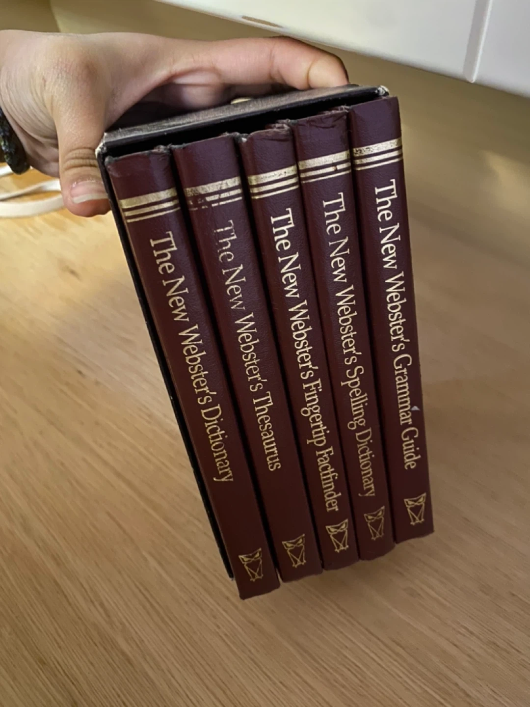 Selling The New Webster's Deluxe Desk Reference Library. It includes 5 hardcover volumes: Dictionary, Spelling Dictionary, Thesaurus, Grammar Guide, and Fingertip Factfinder. Great for office, home and personal use!