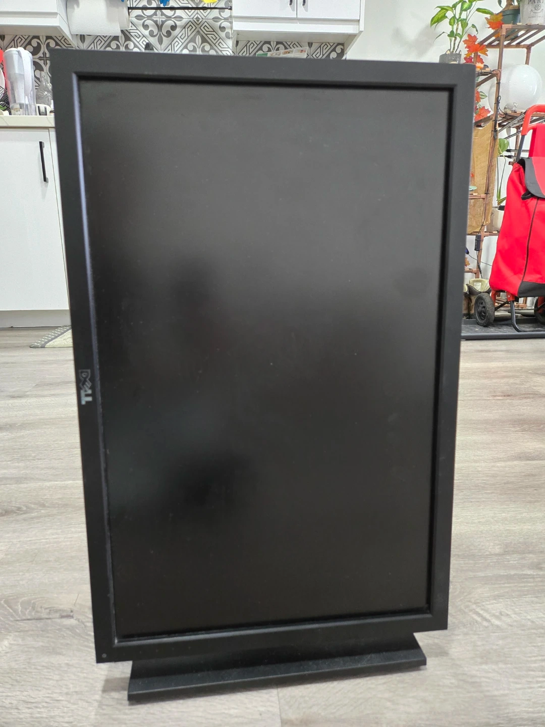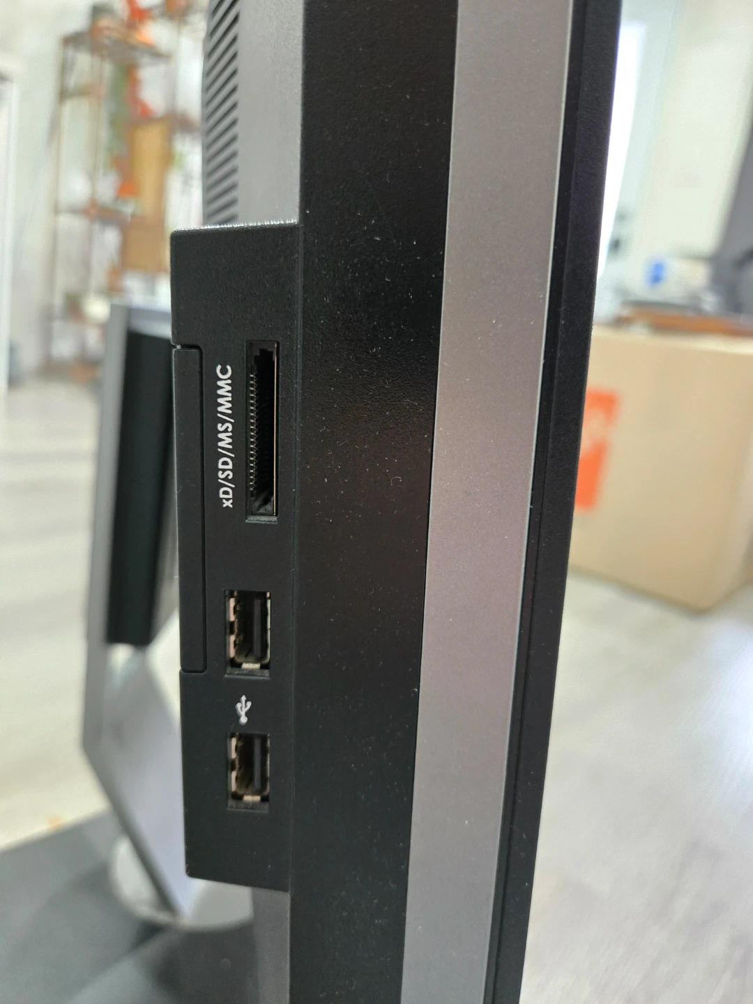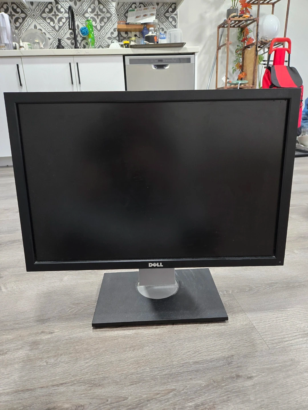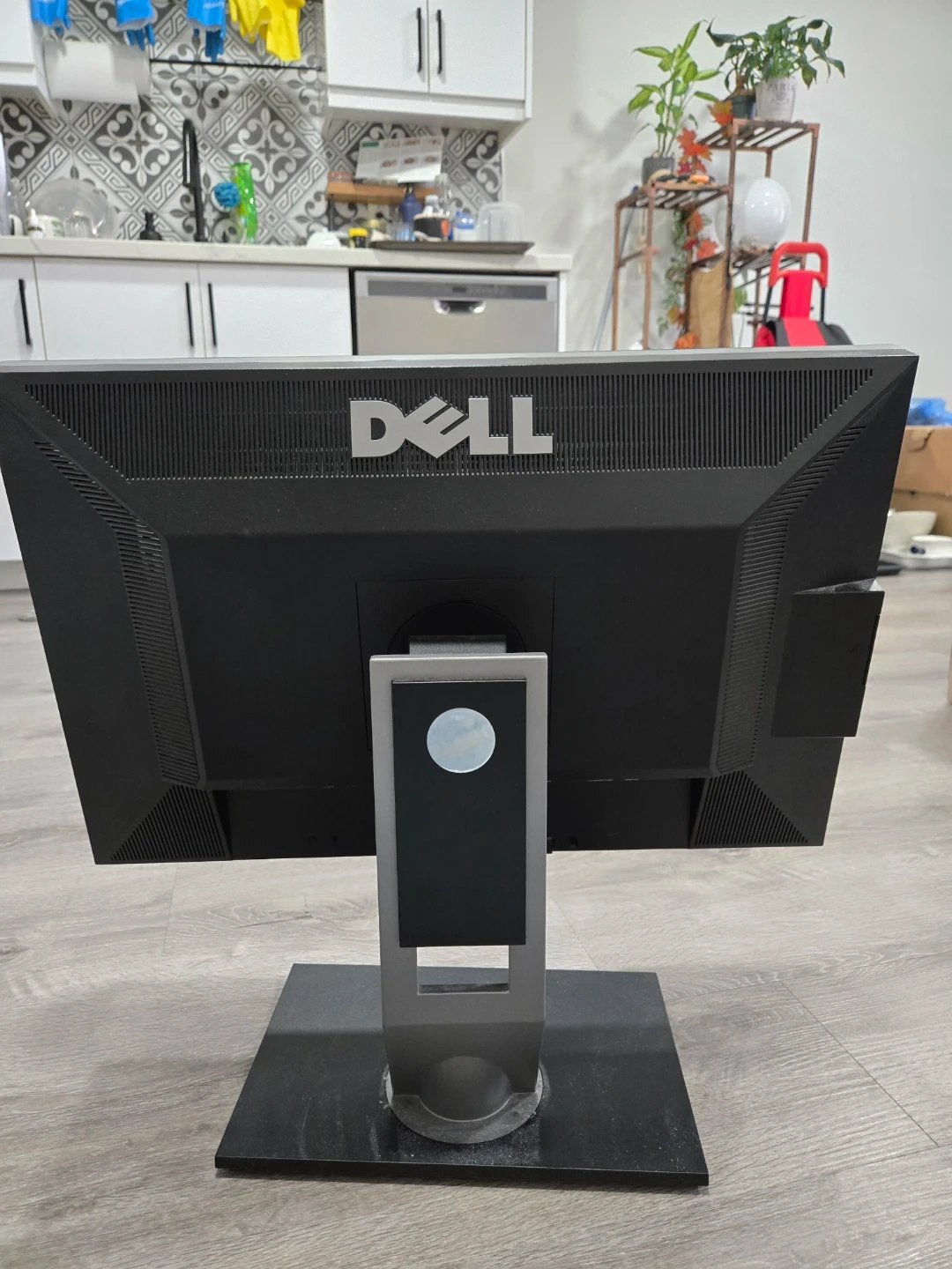 Free Dell monitor 25 inchs. It has DVI-D, VGA, and USB ports, as well as a card reader for xD/SD/MS/MMC cards. Also rotates fully vertical and can lower or raise on the stand.