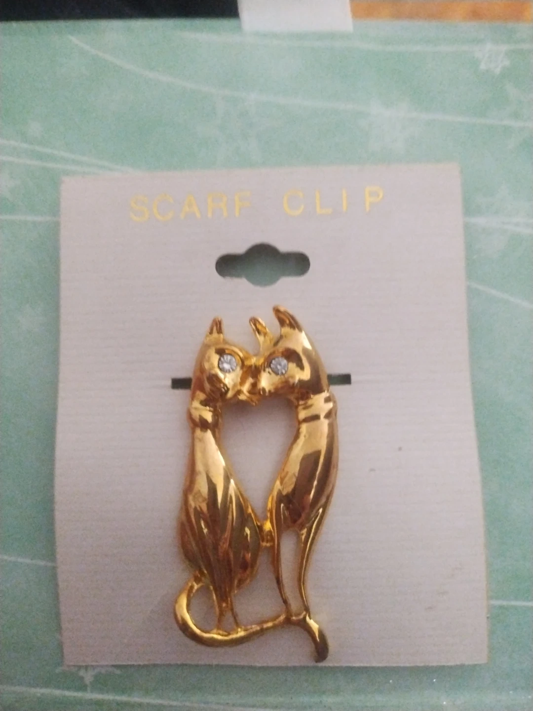Brand new scarf clip featuring two cats in a gold tone finish. It's still attached to its original card, ready to add a touch of feline flair to your scarves or outfits!