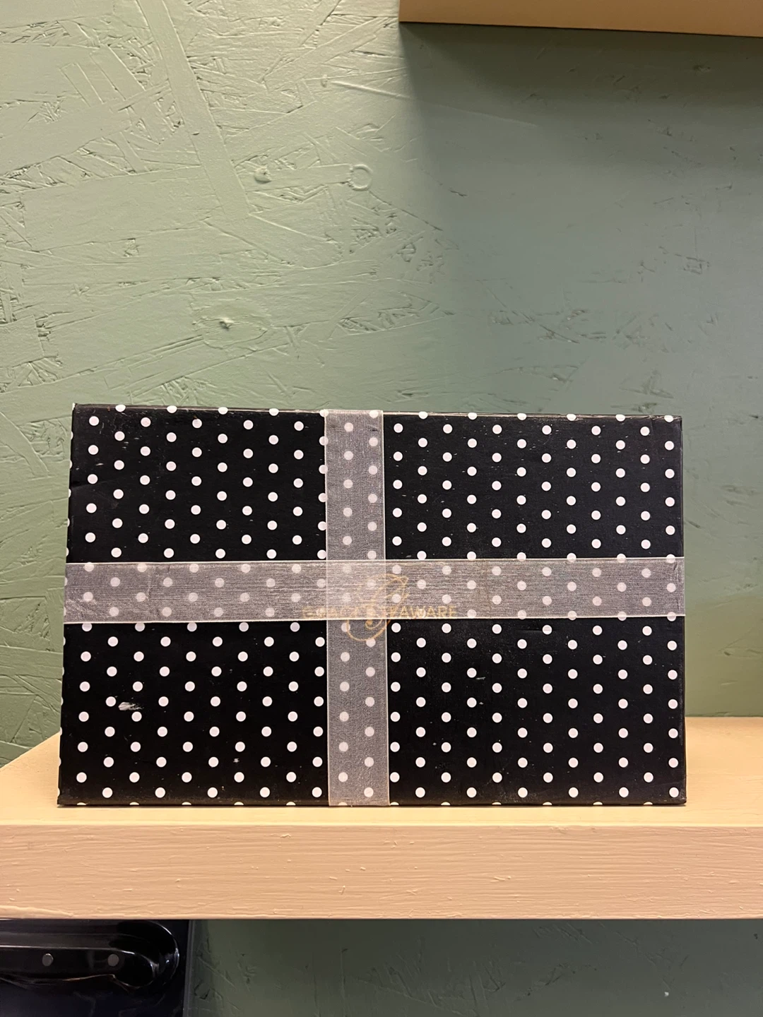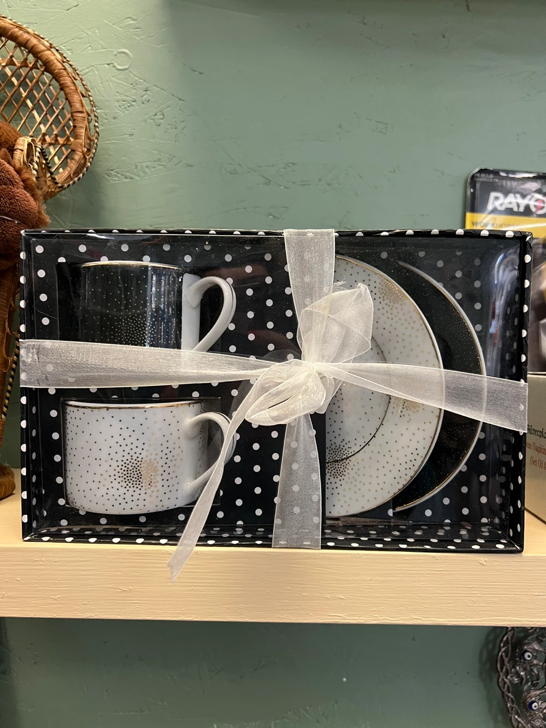 THE PERFECT CHRISTMAS GIFT! This set of 2 cups and saucers is brand new in the box! The set features a stylish polka dot design in black and white, perfect for adding a touch of elegance to your kitchen or dining room.