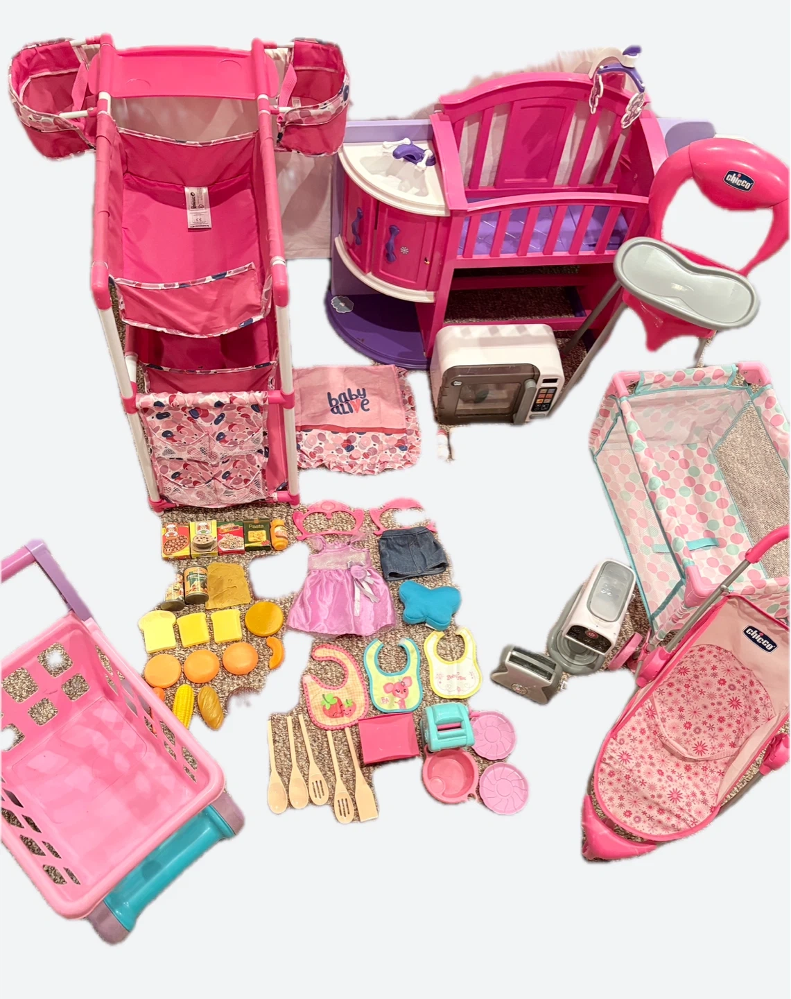 Selling a large lot of dolls and doll accessories! This includes multiple dolls of various sizes and styles, along with a variety of clothing items, accessories like purses and medical kits, and even doll furniture such as a crib and stroller. Perfect for hours of imaginative play!
