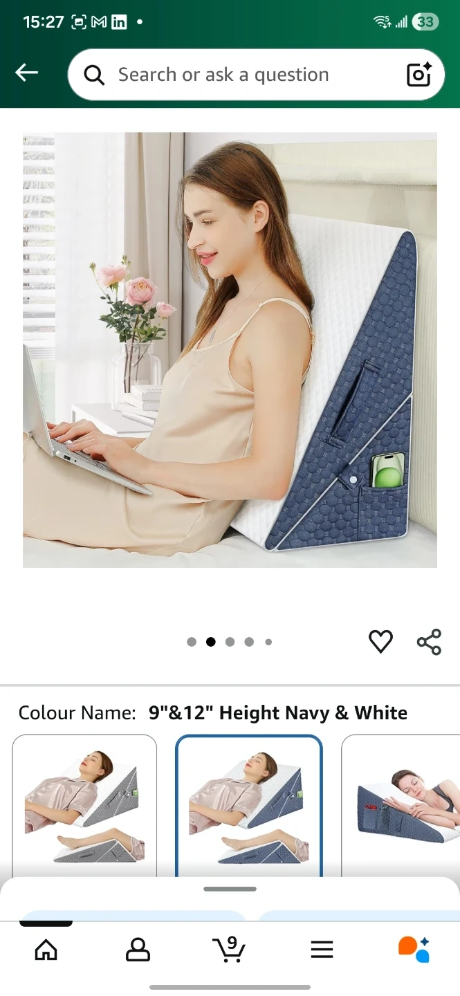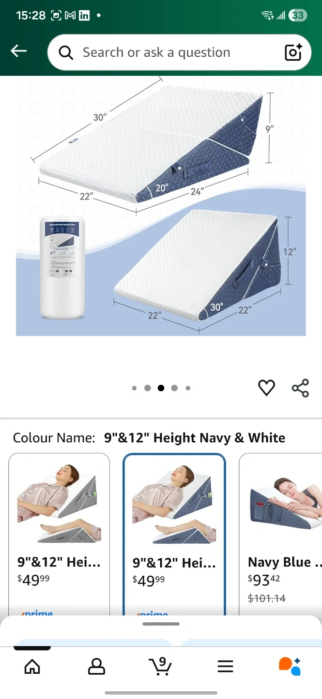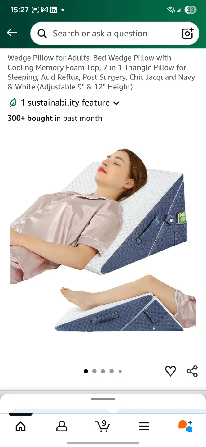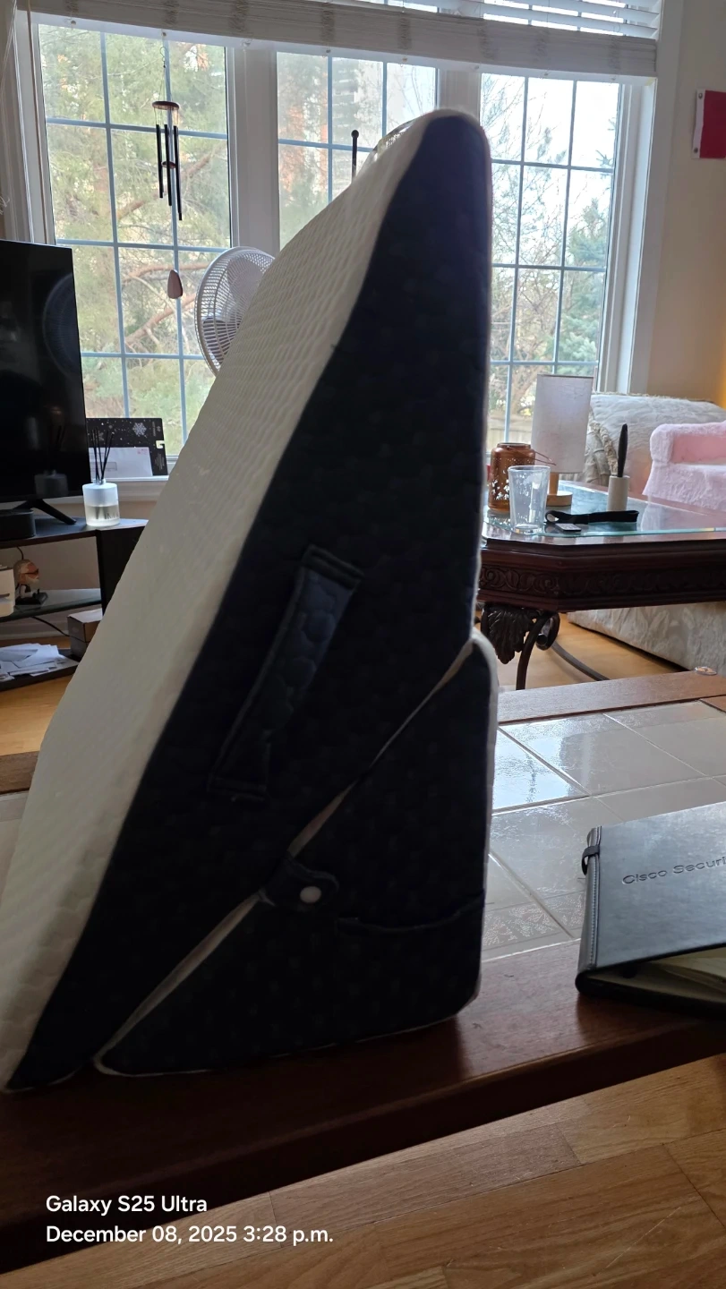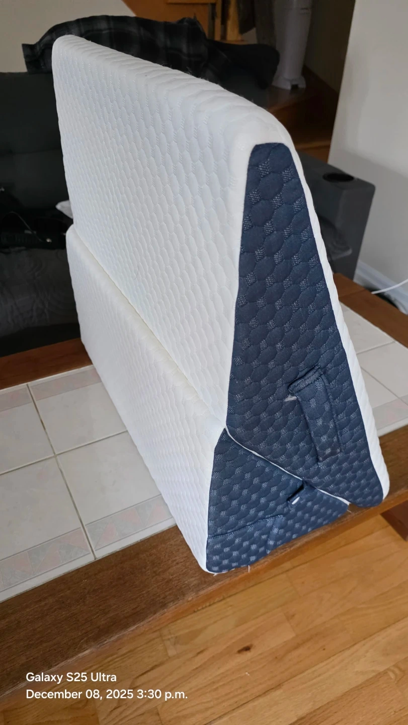 Selling a bed wedge pillow for adults. It's a cooling memory foam top, perfect for sleeping, acid reflux, or post-surgery comfort. It's a 7 in 1 triangle pillow in chic jacquard navy & white. Adjustable 9" & 12" height