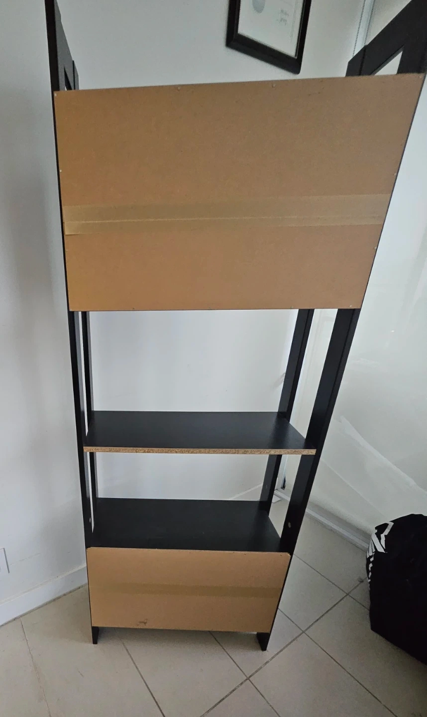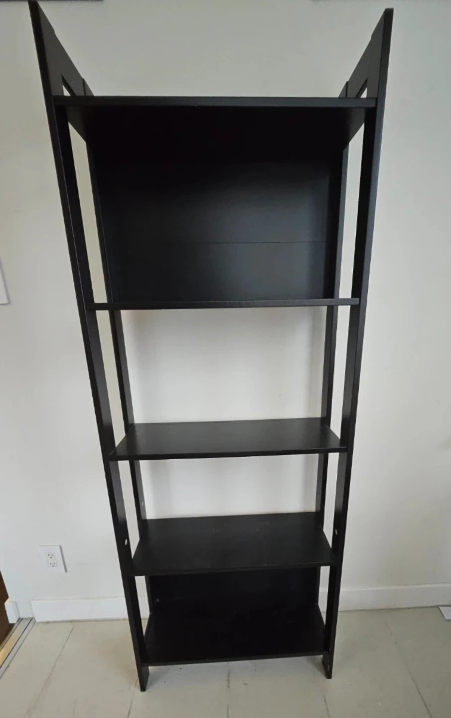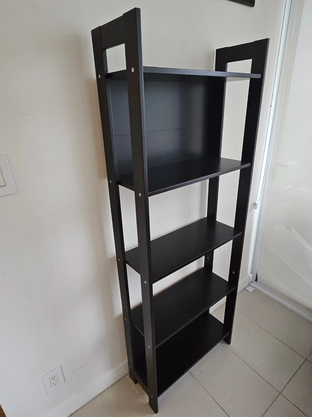 Selling a black ladder shelf with 5 tiers. It's in great condition and perfect for displaying books, plants, or other decorative items. It's a stylish and functional piece for any room!