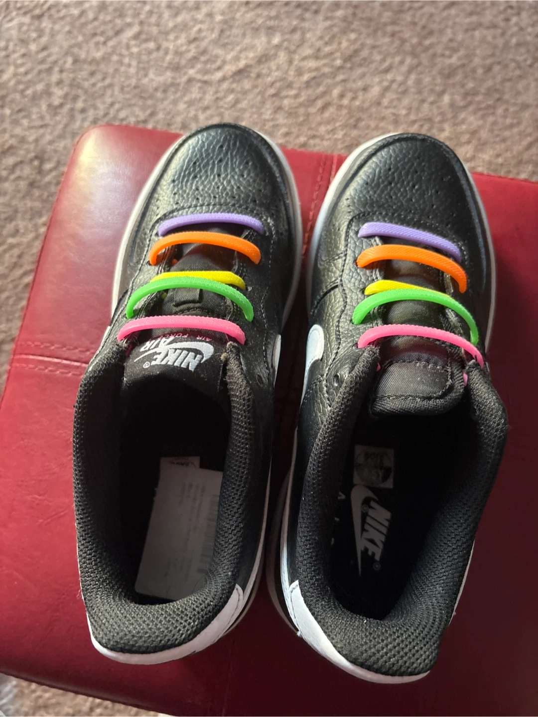 Selling a pair of Nike Air Force 1 kids' sneakers in black. They have some fun, colourful laces. Great condition and ready for a new owner! Size 6 youth.
