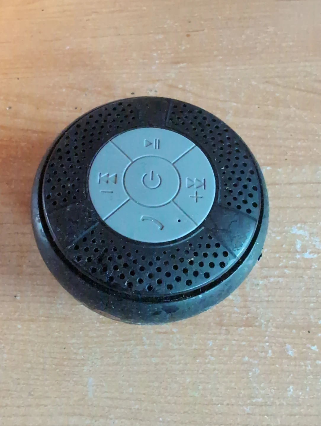 Selling a used Bluetooth shower speaker. It's black and has buttons for play/pause, volume, and answering calls. Great for listening to music in the shower!