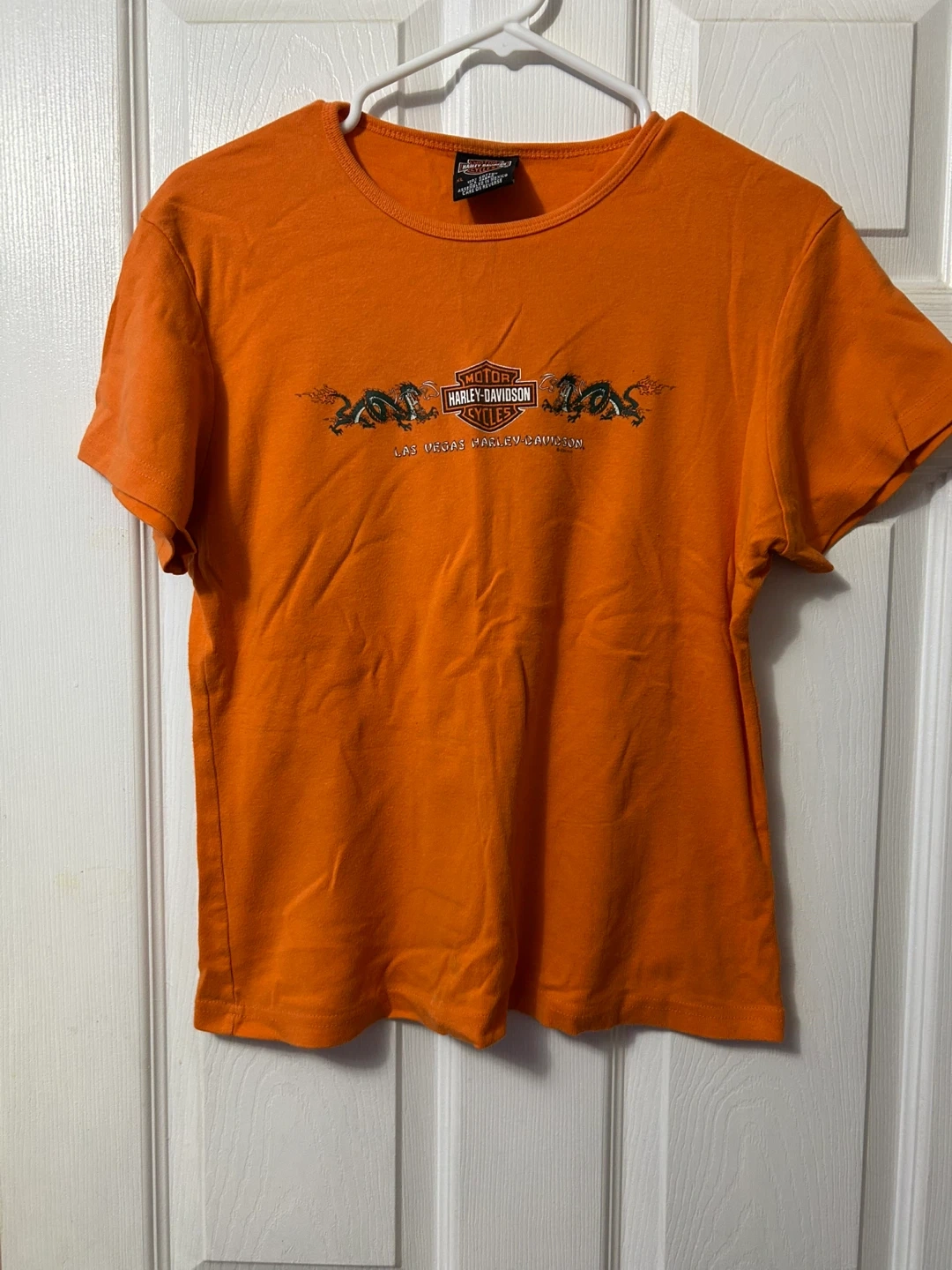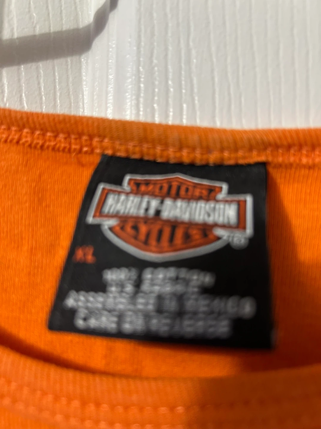 Selling an orange Harley-Davidson t-shirt in size XL. It's in good condition and features the Harley-Davidson logo on the front and back. The material is 100% cotton, making it super comfy!