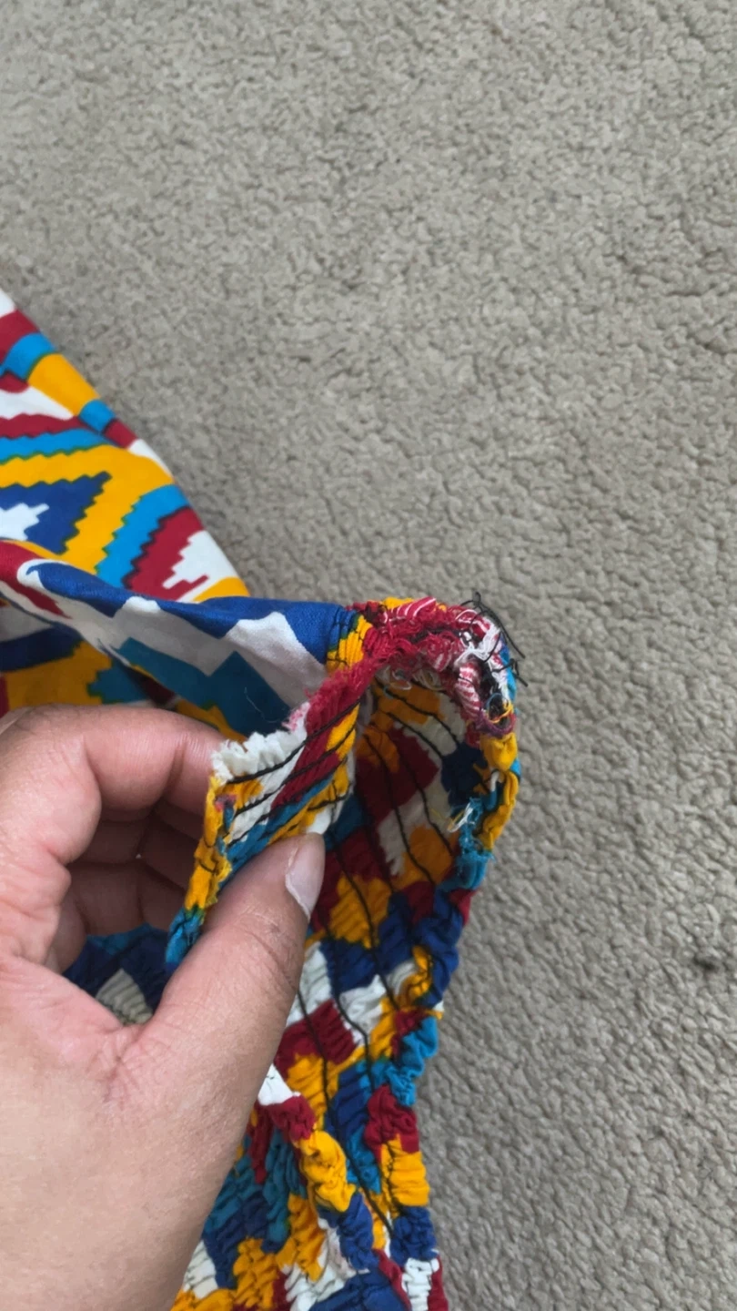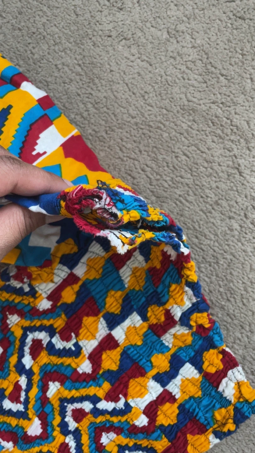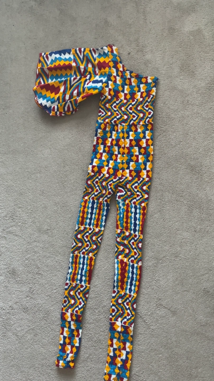 This jumpsuit features a vibrant and eye-catching pattern with a smocked design. It's in used condition, as shown in the photos.