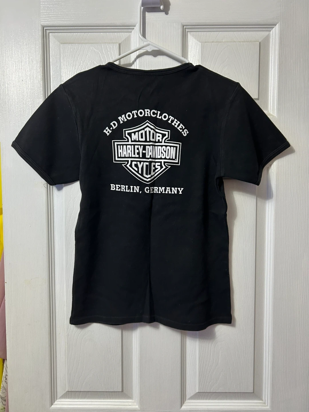 Here's a Harley-Davidson black t-shirt. It has the classic Harley-Davidson logo on both the front and the back. The back also says H-D Motorclothes and Berlin, Germany. It's in great condition!