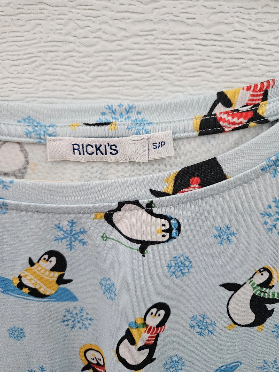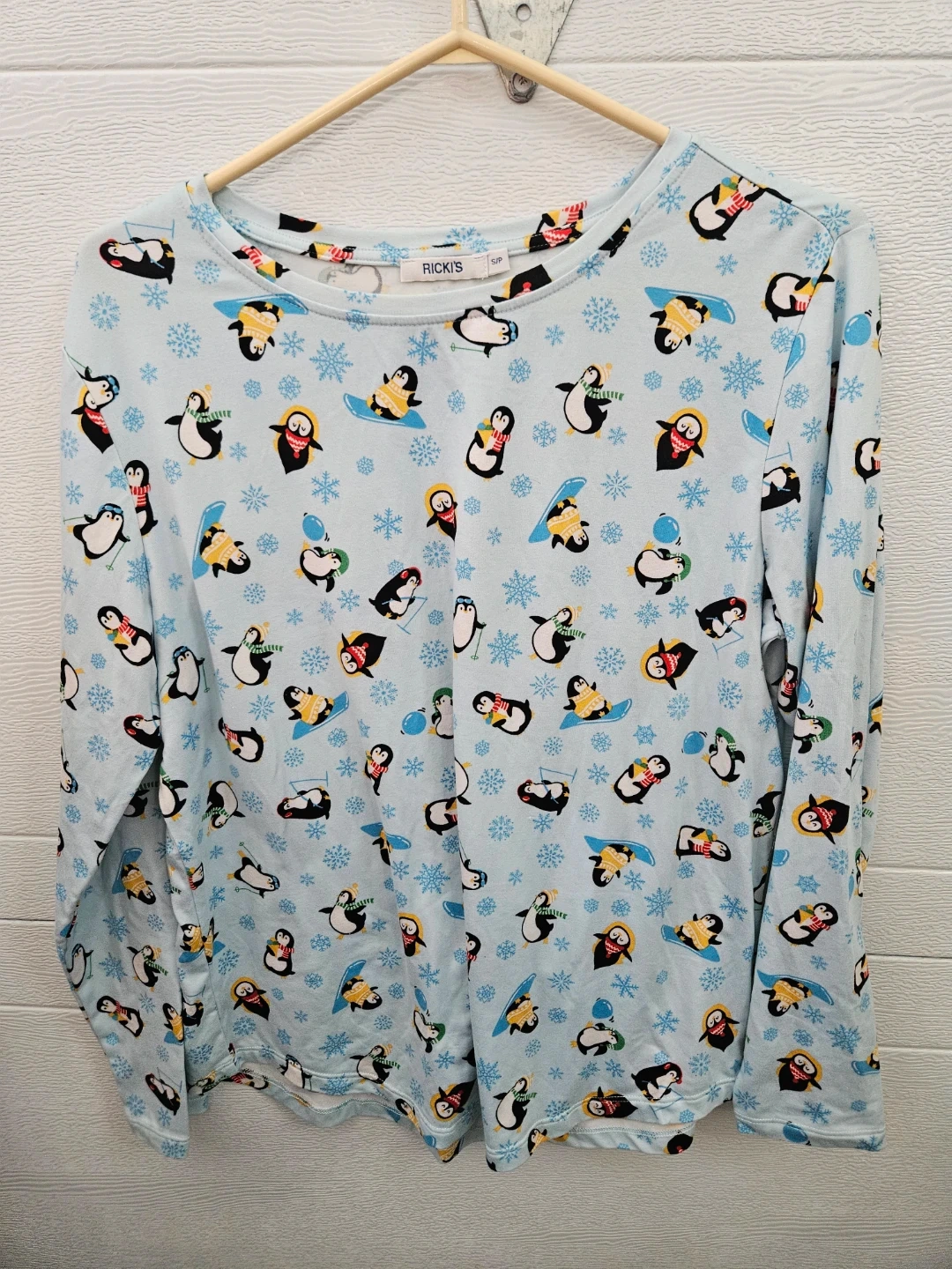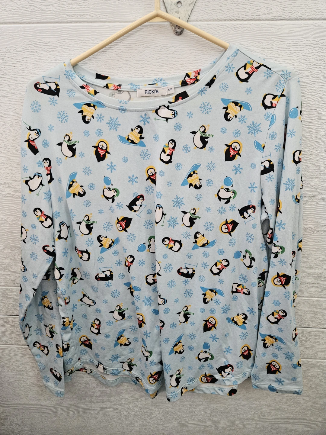 Cute RICKI'S long-sleeve top with an all-over penguin and snowflake print! It's a size small.