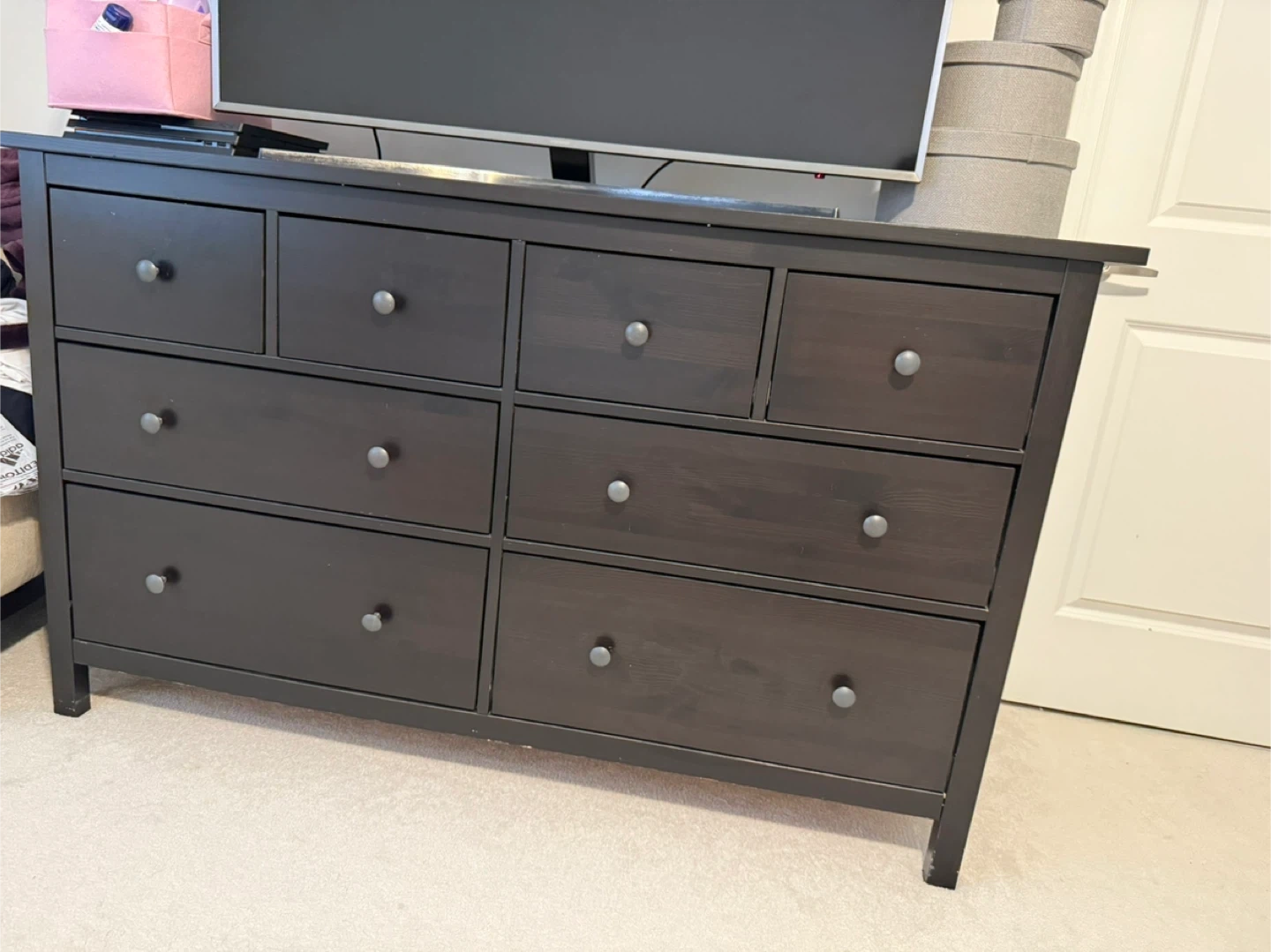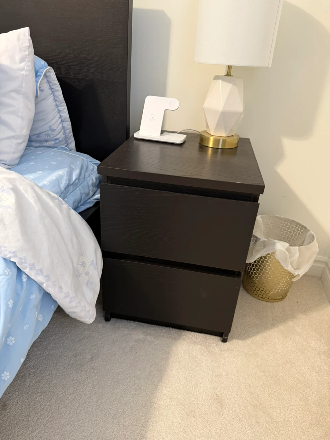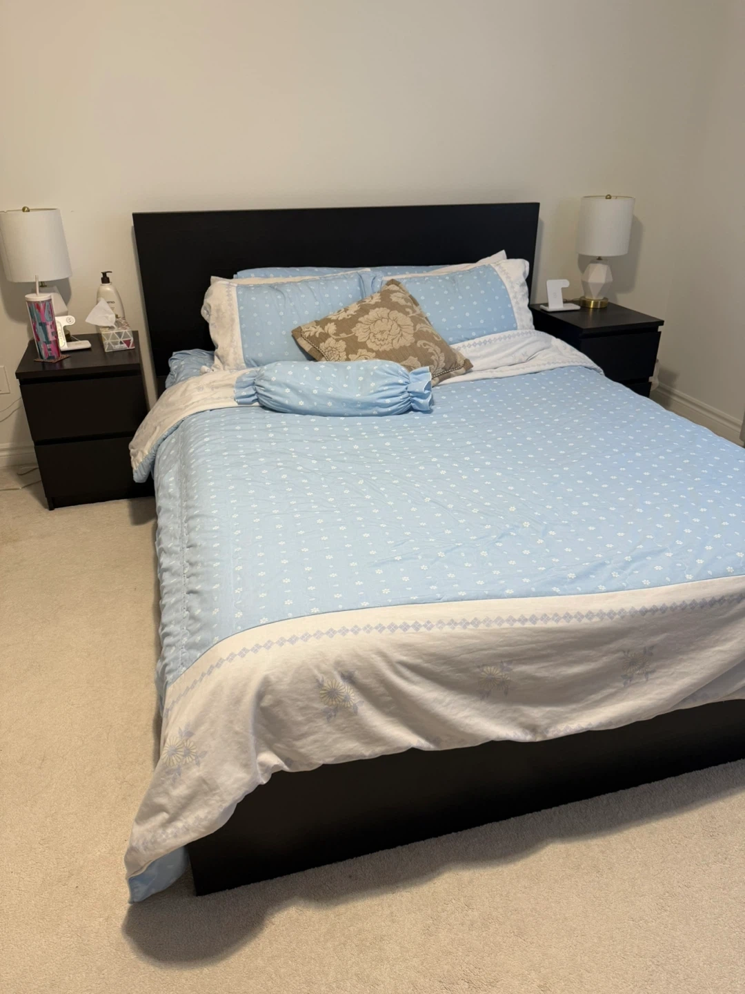 Selling a used IKEA Hemnes dresser and MALM queen bed frame and mattress, Hemnes 5-drawer chest & 2 night stand . They are in good condition and would be a great addition to any bedroom!